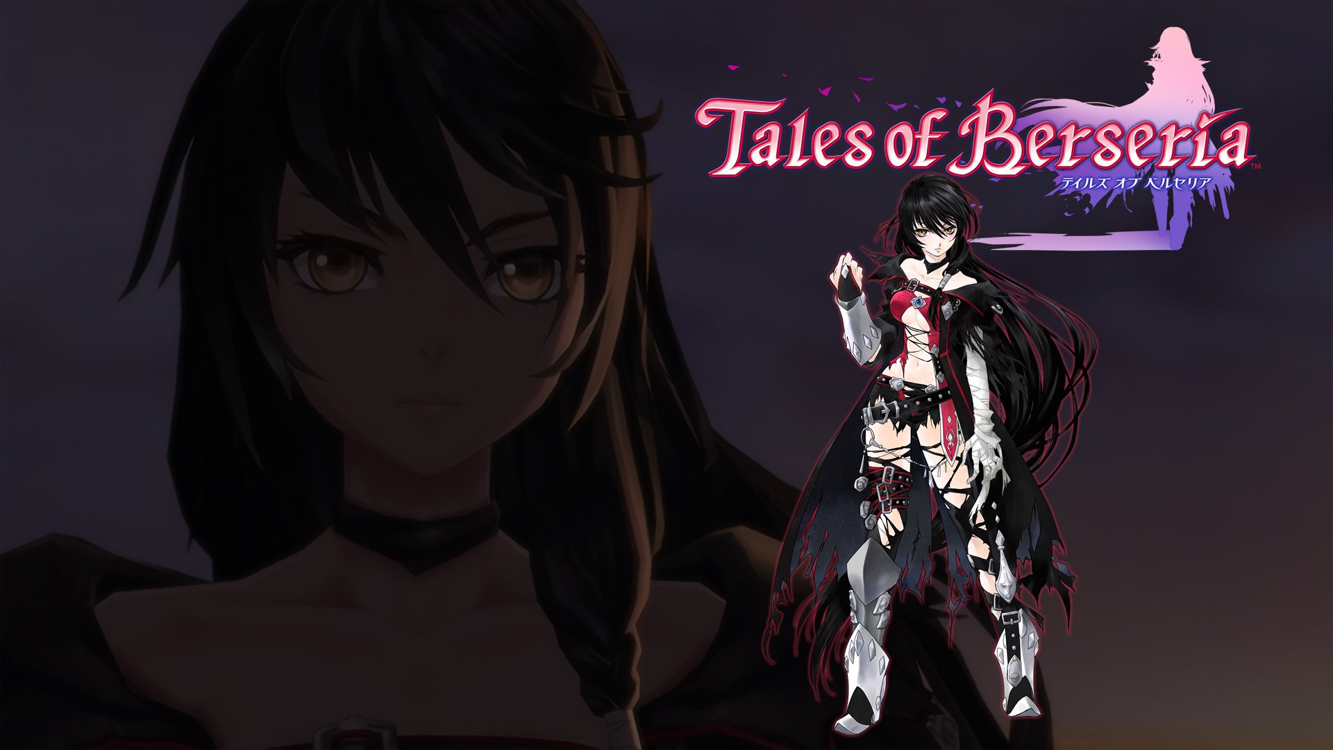 Description: A woman in a black dress standing next to a sign that says tales of berseia on it.