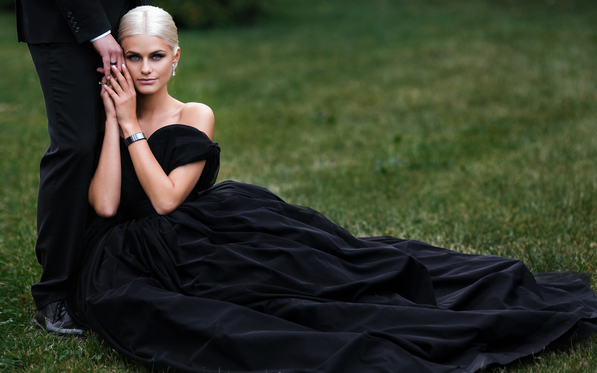 Description: A woman in a black dress sitting on the ground with her hands on her face and a man in a suit standing behind her.