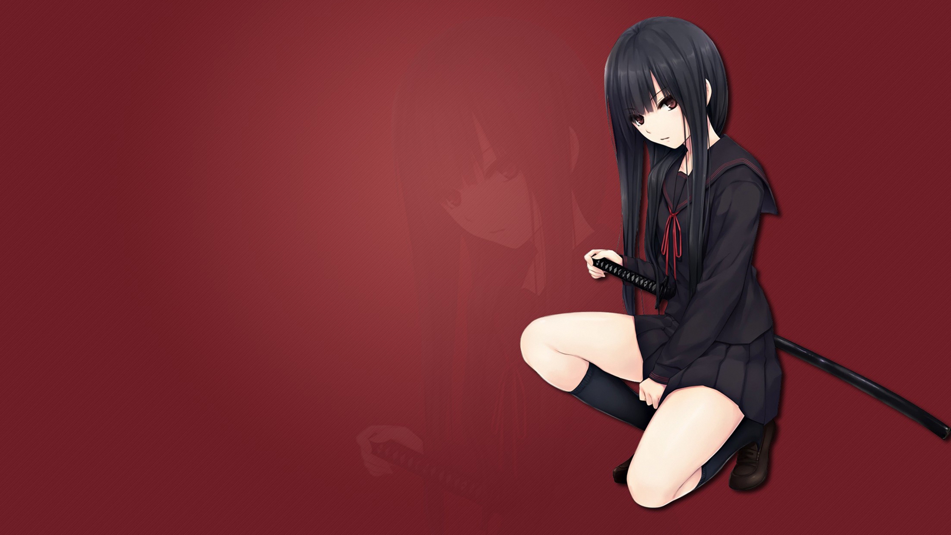 Description: A woman in a black dress sitting on a red background with a sword in her hand and a black cat on her knee.