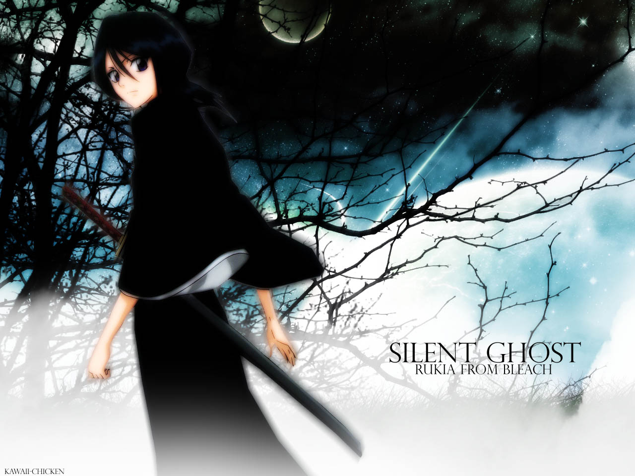 Description: A woman in a black dress holding a sword in front of a full moon and tree with branches in the background.