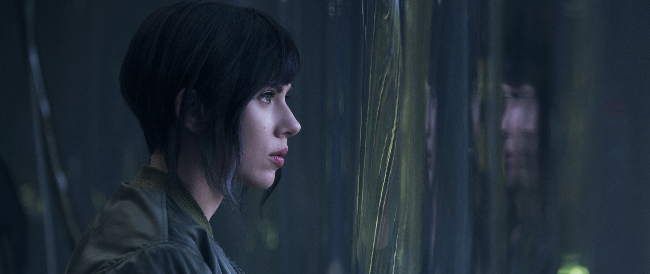 Description: A woman with black hair and bangs standing in front of a wall with a mirror behind her and looking off to the side.