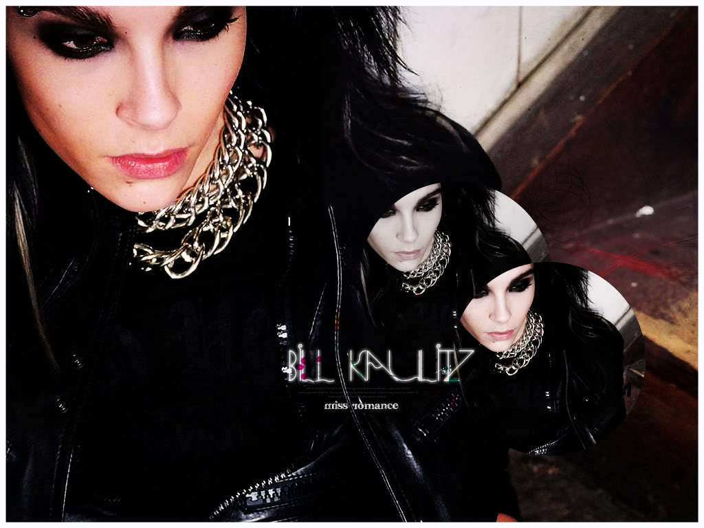 Description: A woman with black hair and a black outfit with chains around her neck and two dolls in front of her.