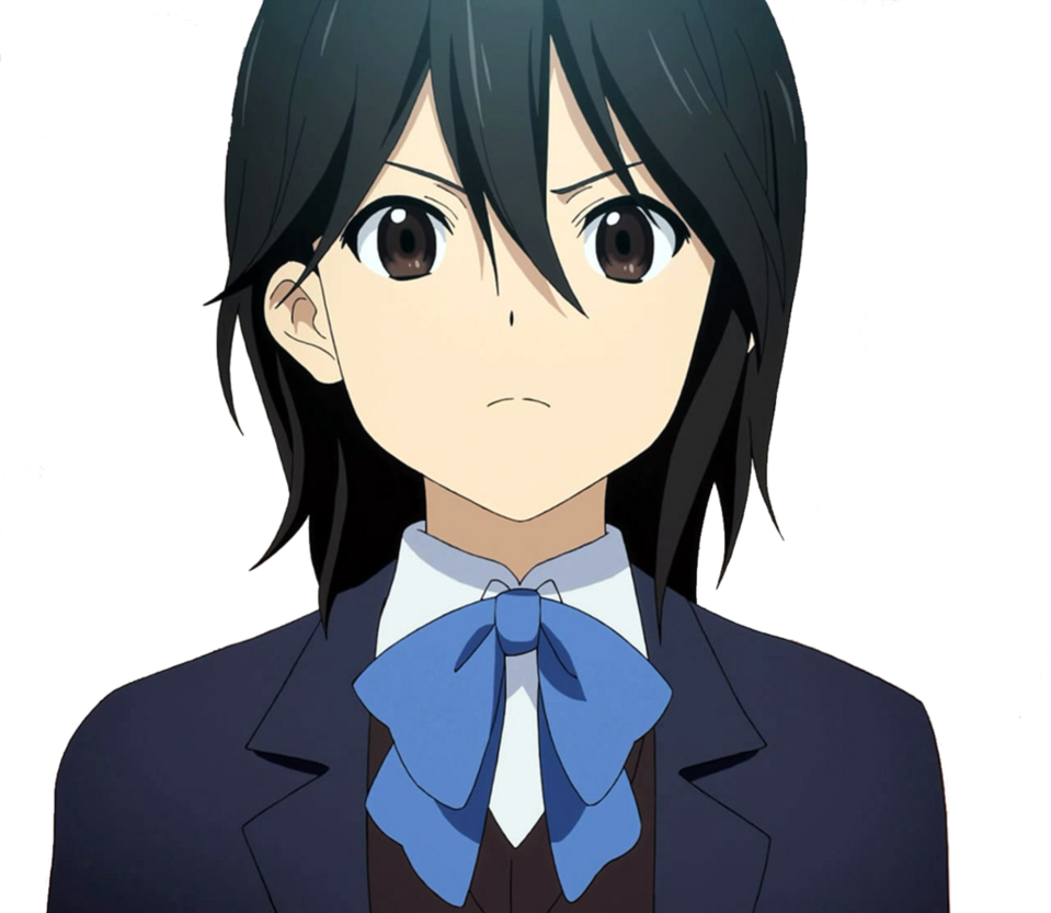Description: A woman with black hair and a blue bow tie in a suit and tie with a black background and a white background.