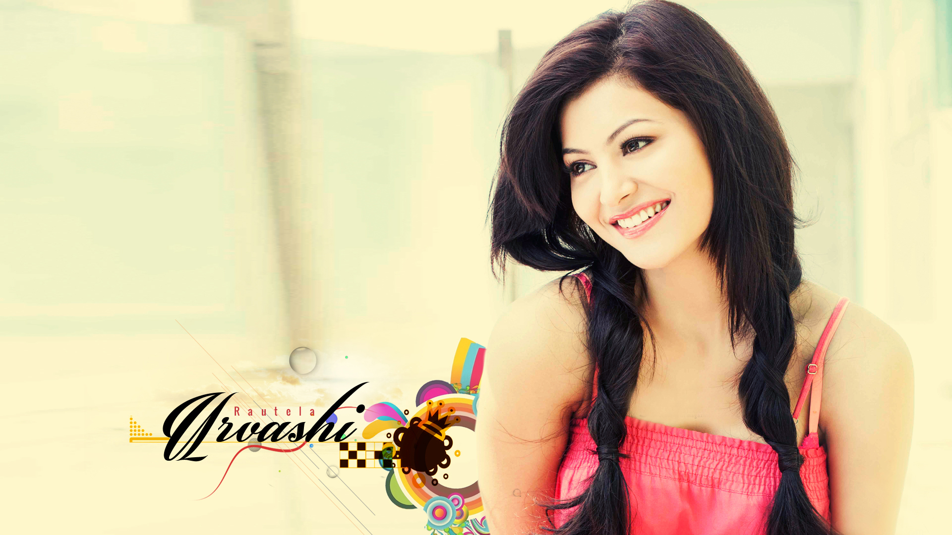 Description: A woman with long black hair and a pink top smiling at the camera with a colorful background behind her.