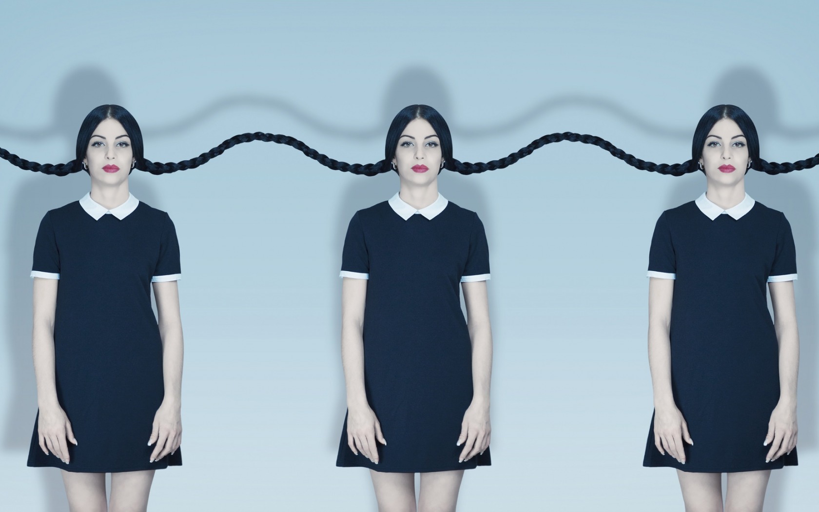 Description: A woman with a long black hair is shown in three different poses.
