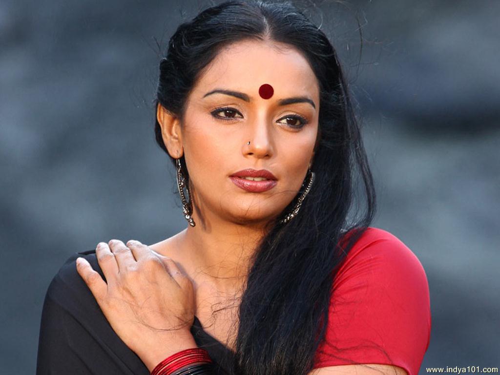 Description: A woman with long black hair and a red shirt is posing for a picture with her hands on her chest.