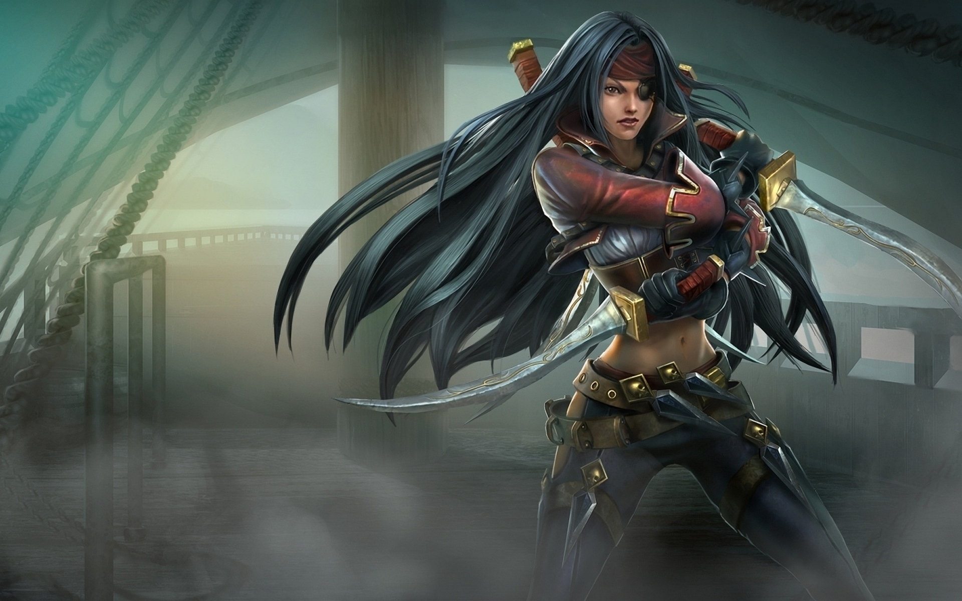 Description: A woman with long black hair holding a sword in her hands and wearing a red outfit with gold accents.