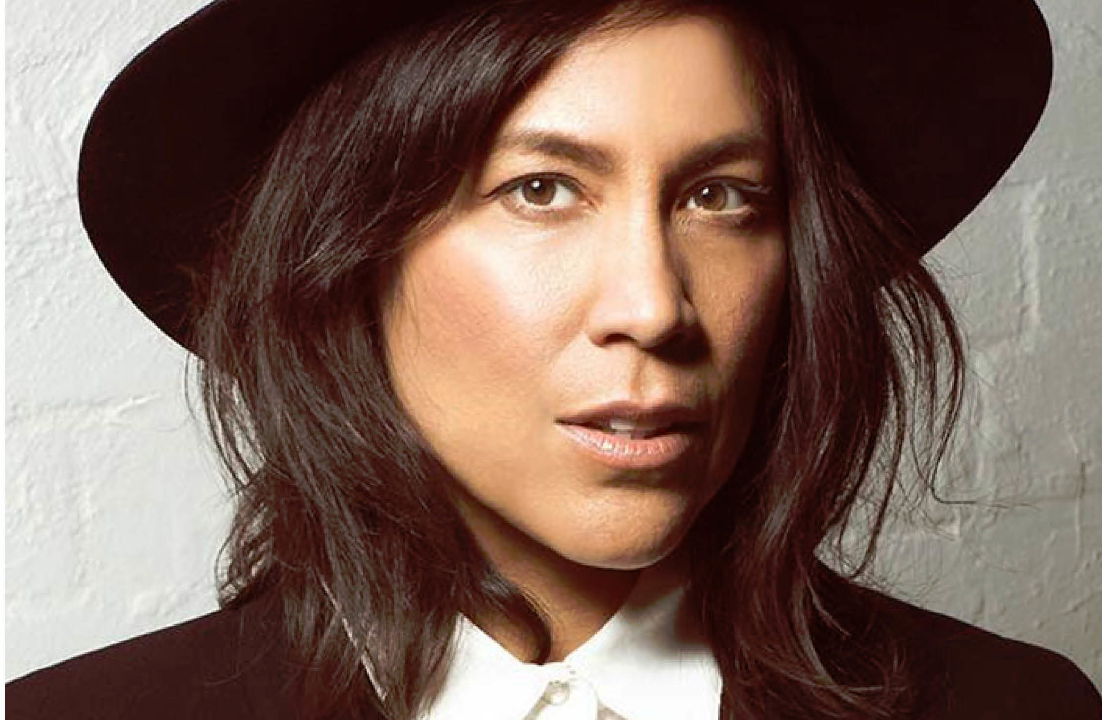 Description: A woman wearing a black hat and a white shirt and tie and a black jacket and a white wall.