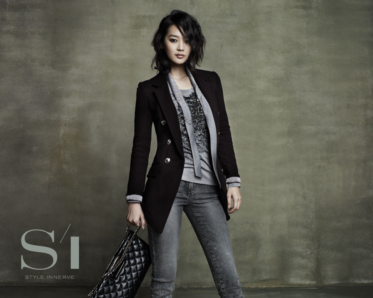 Description: A woman in a black jacket and jeans holding a purse and posing for a picture in front of a wall.