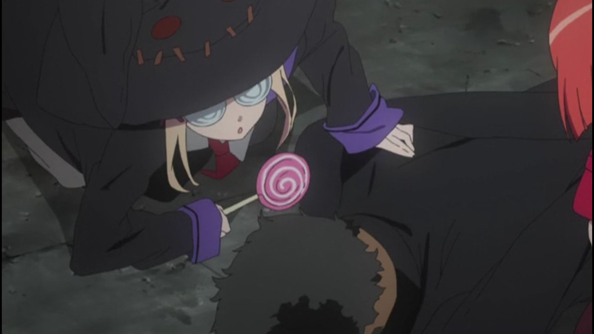 Description: A woman in a black outfit holding a lollipop in her hand and a man in a black suit and tie.