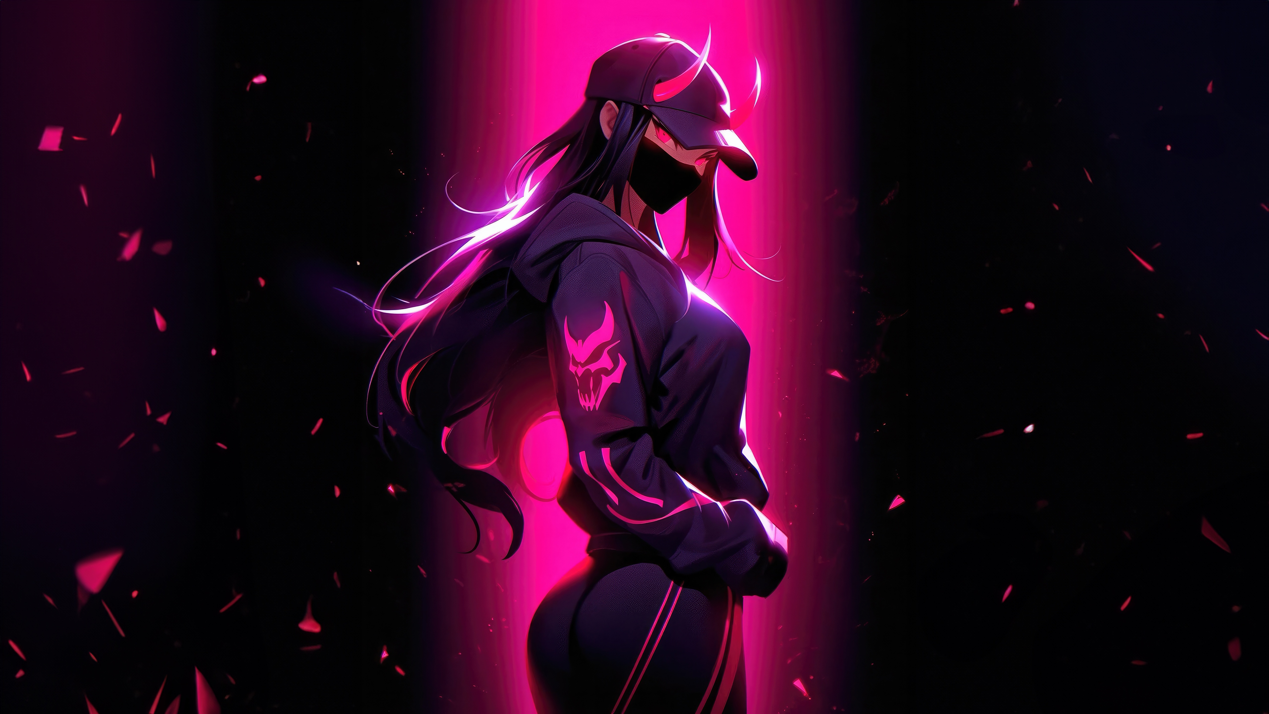 Description: A woman in a black outfit standing in front of a pink background with confetti around her neck.