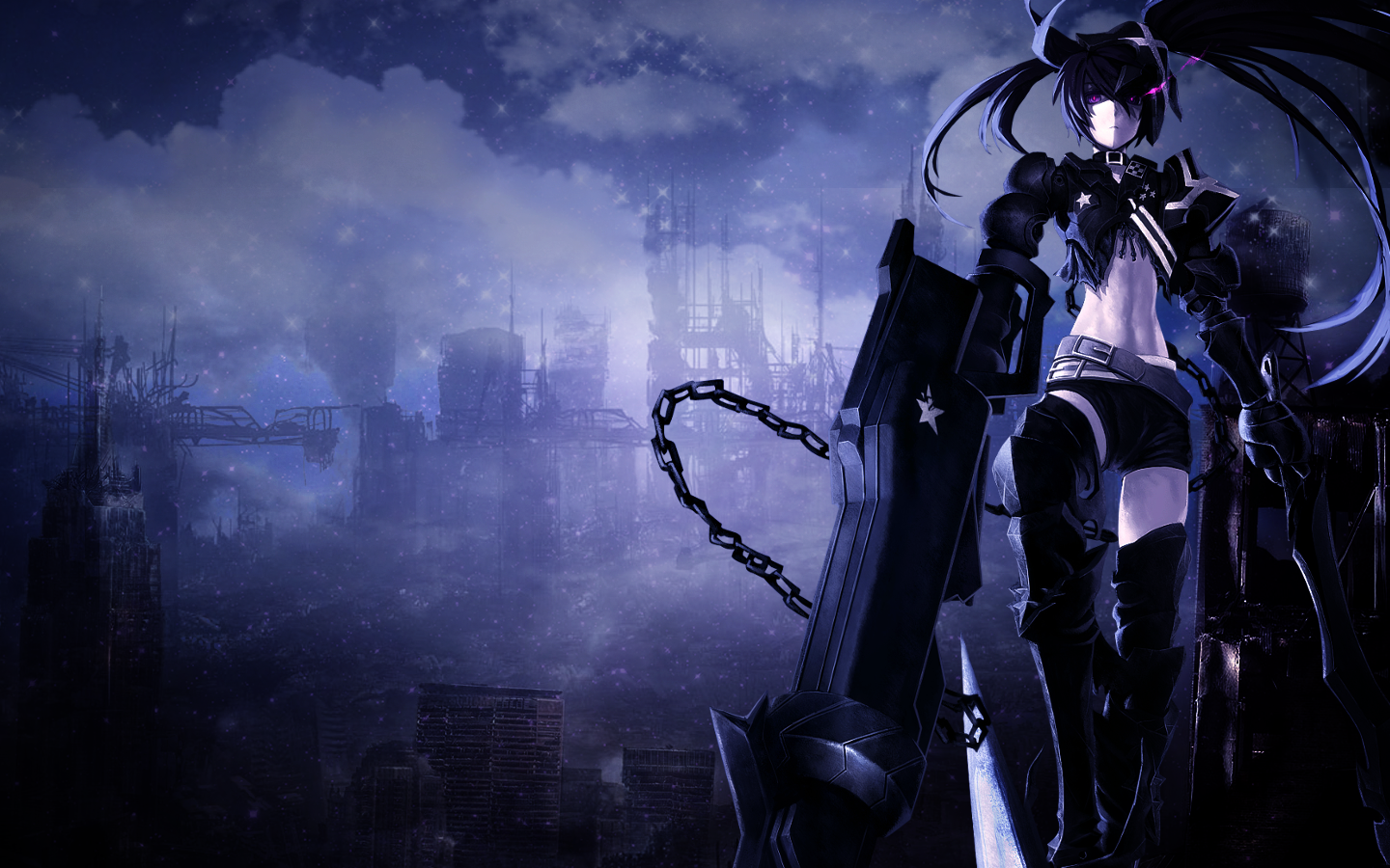 Description: A woman in a black outfit holding a sword in a city at night with a chain hanging from her shoulder.