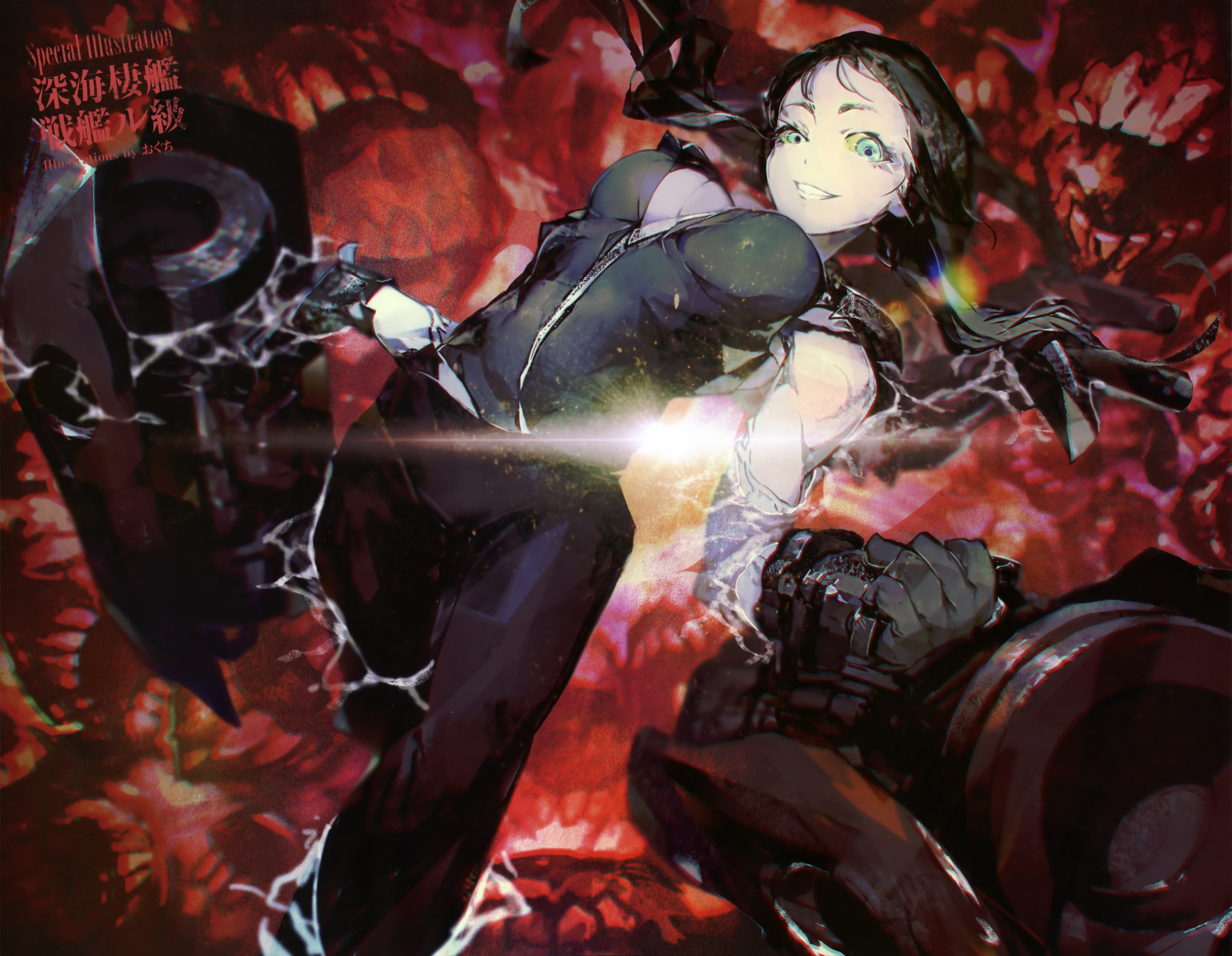 Description: A woman in a black suit and a gun in her hand and a red background with a red flower.