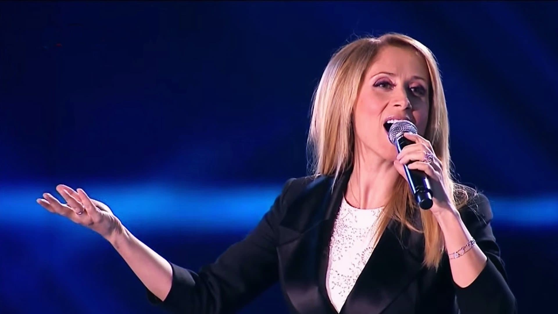 Description: A woman in a black suit singing into a microphone on stage with her hands out and her hands out.