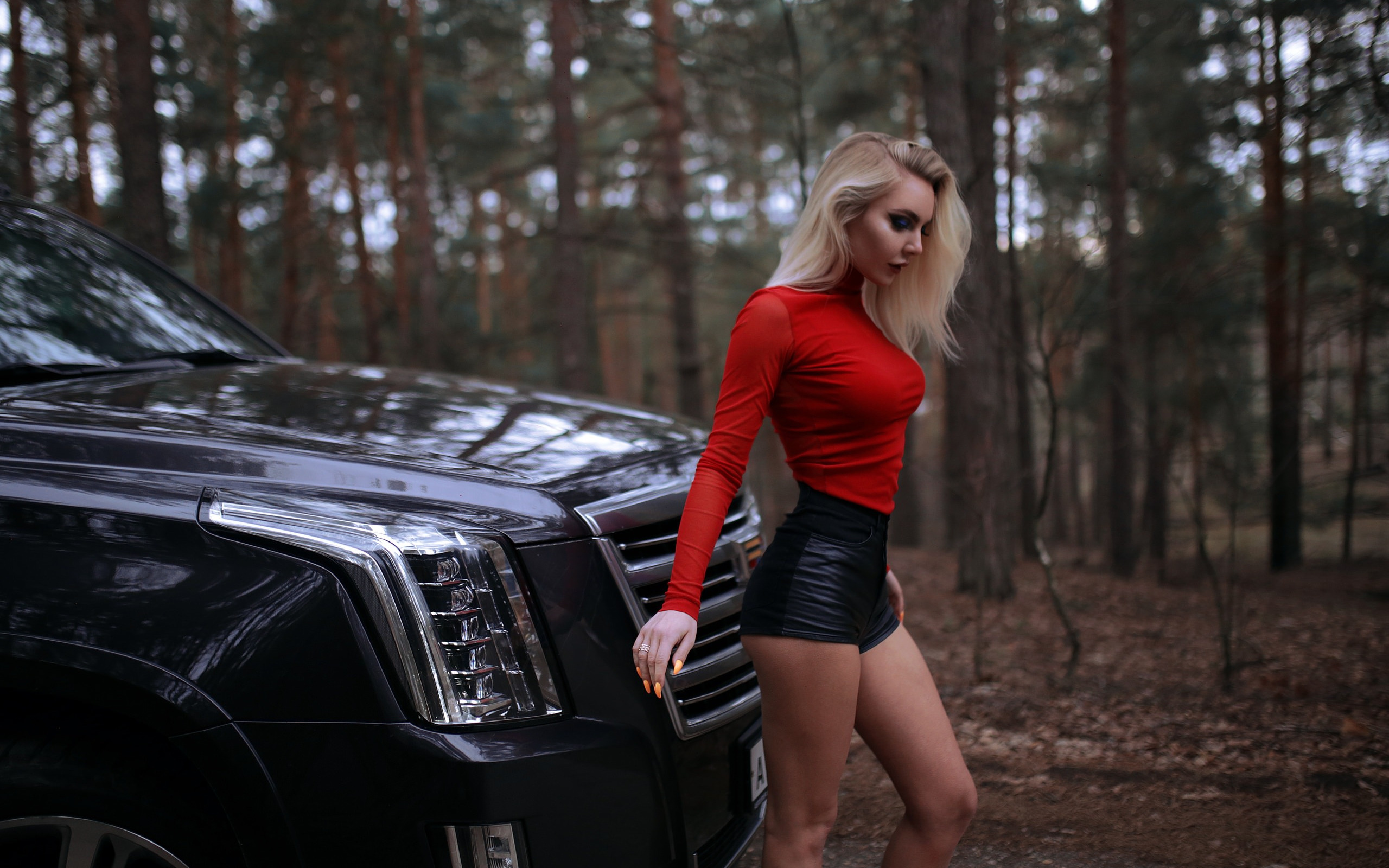 Description: A woman in a short skirt standing next to a black suv in the woods with trees in the background.