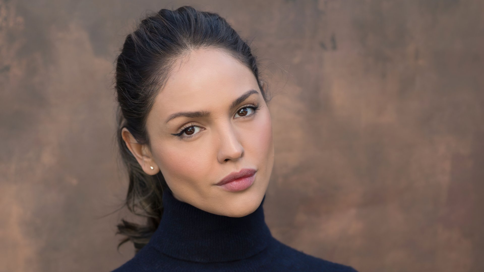 Description: A woman with a black turtle neck sweater and a brown background is looking at the camera and she is wearing a pair of earrings.