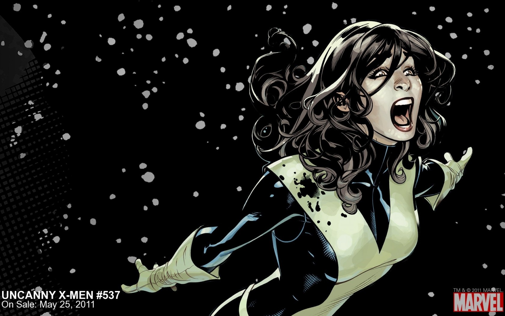 Description: A woman in a black and white dress with her mouth open and her hands out in the air.