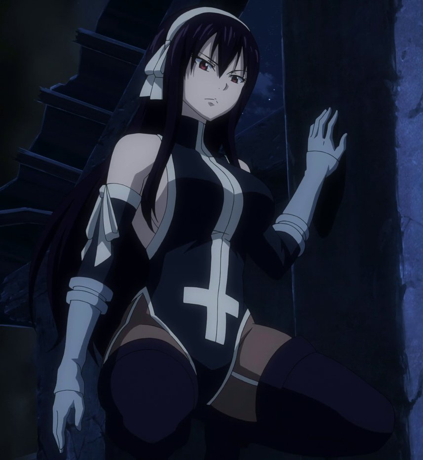 Description: A woman in a black and white outfit with a cross on her chest and hands up in the air.