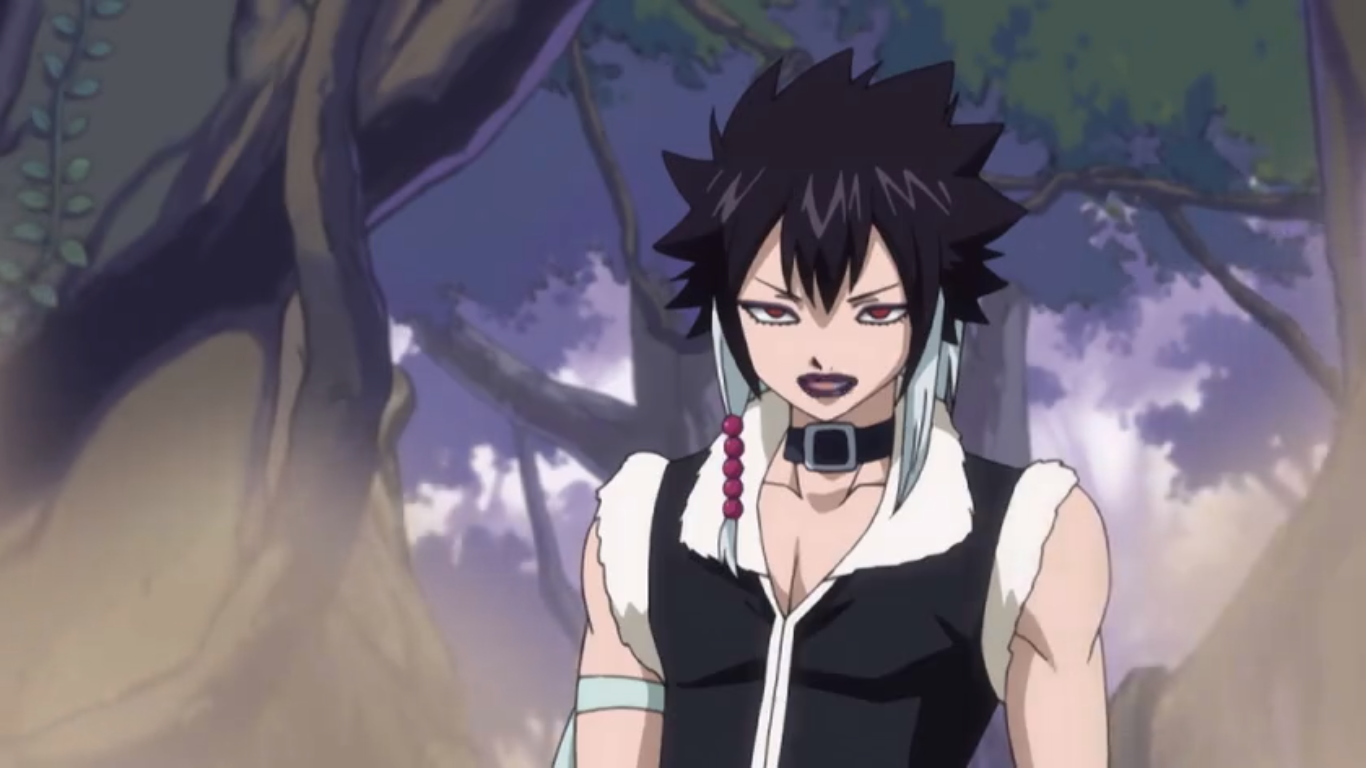 Description: A woman in a black and white outfit standing in a forest with trees and a cell phone in her hand.