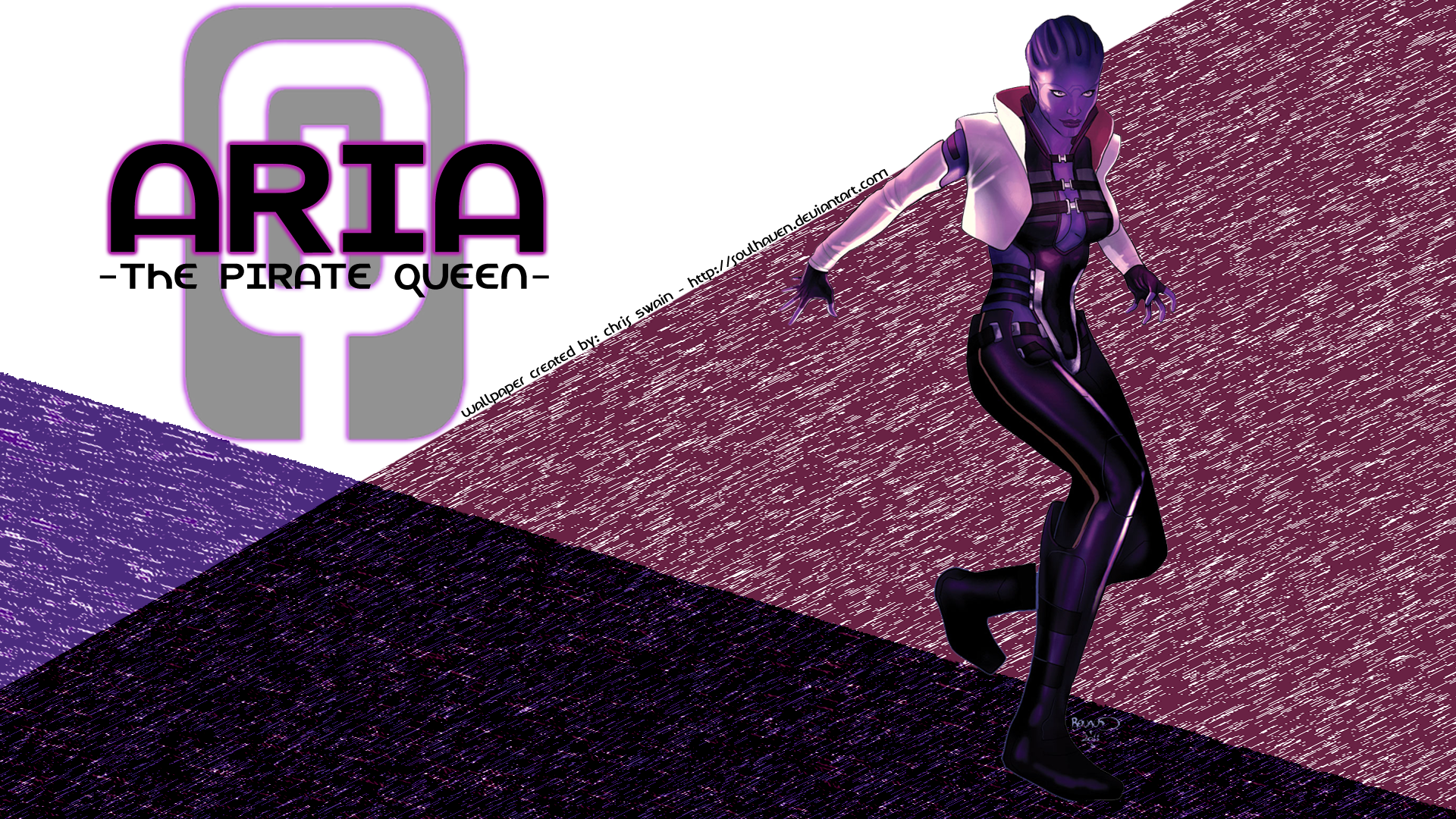 Description: A woman in a black and white outfit is running in a purple and black background with the words aria on it.