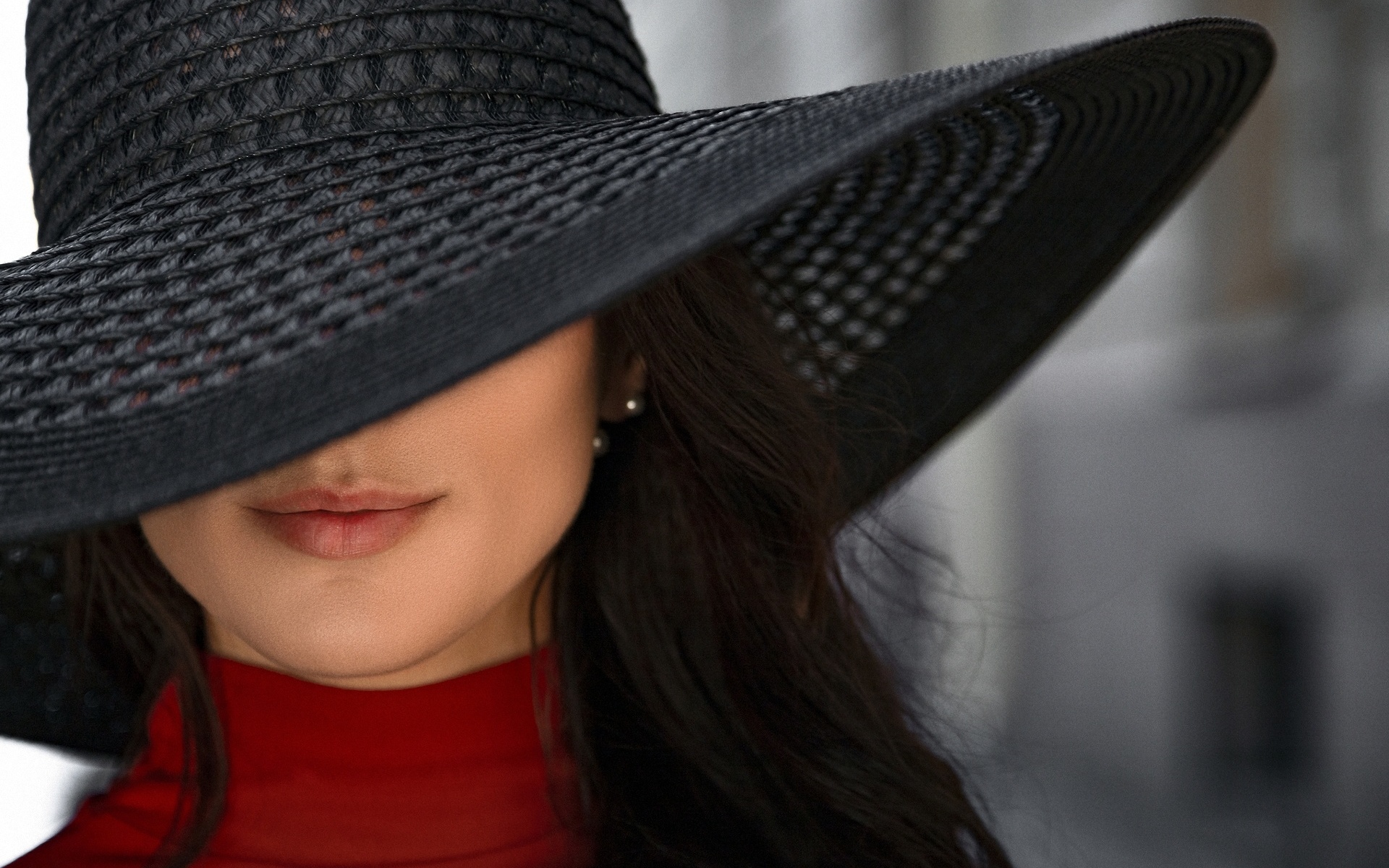 Description: A woman wearing a black hat with a red shirt on her chest and a red shirt on her chest.