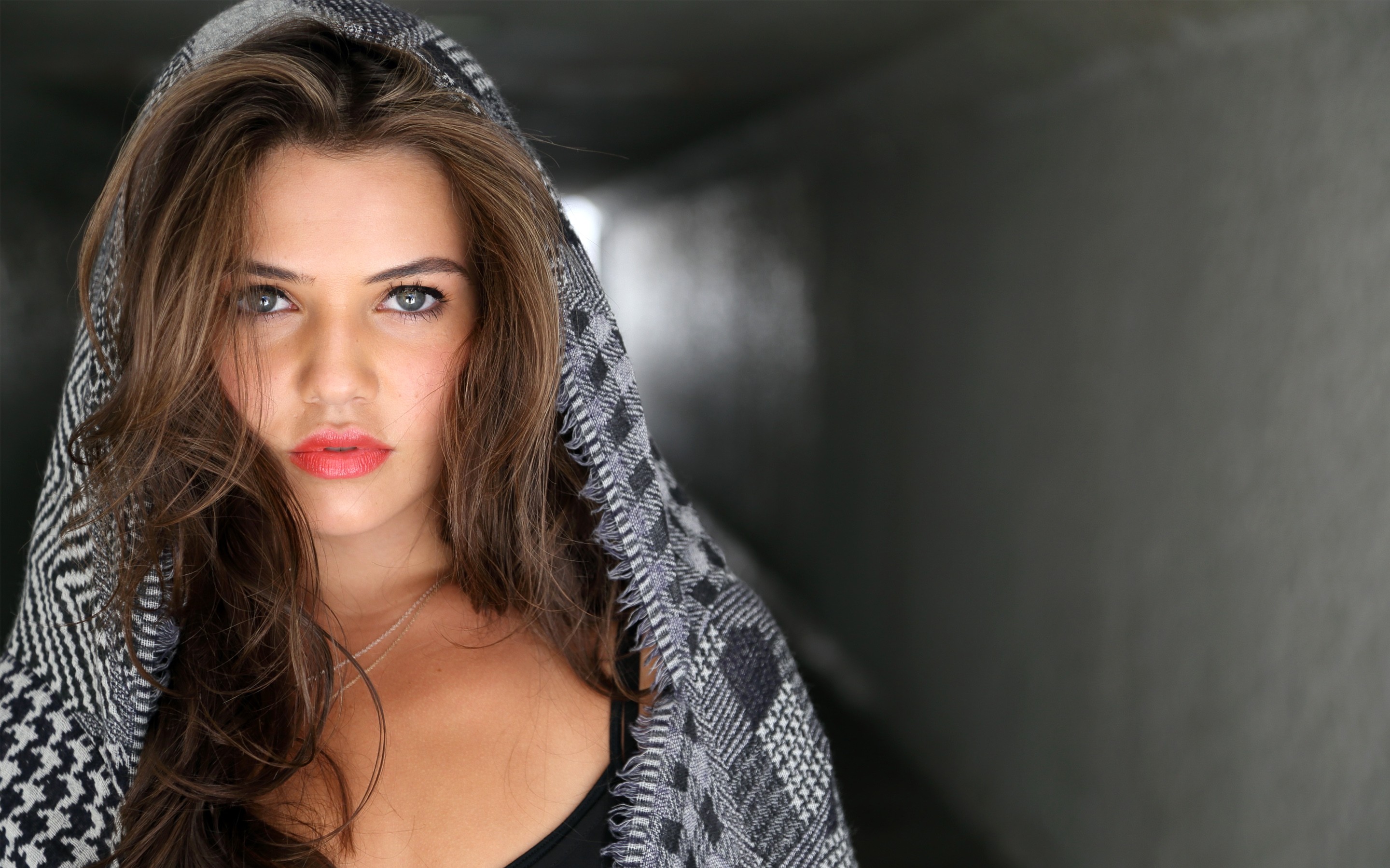 Description: A woman with a blanket over her head and a black and white jacket on her head and a red lip.