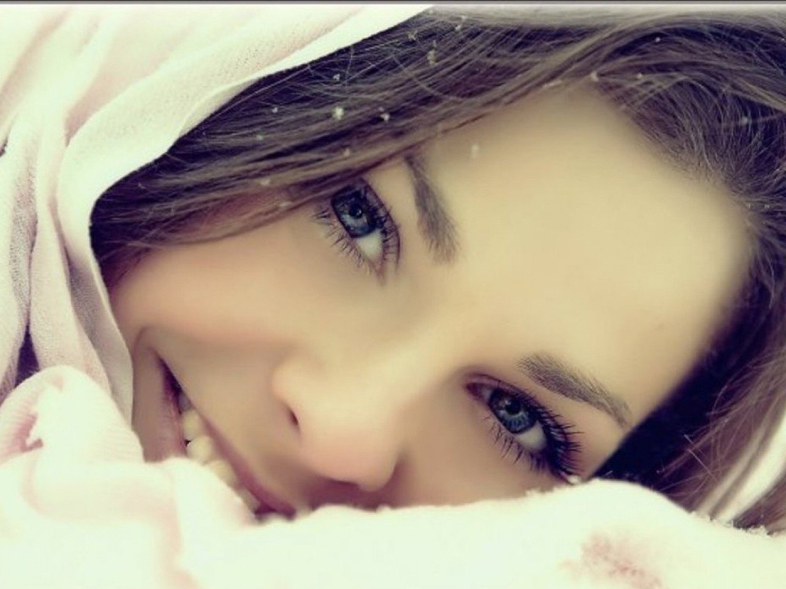 Description: A woman with a blanket on her head and eyes open and smiling at the camera with a smile on her face.