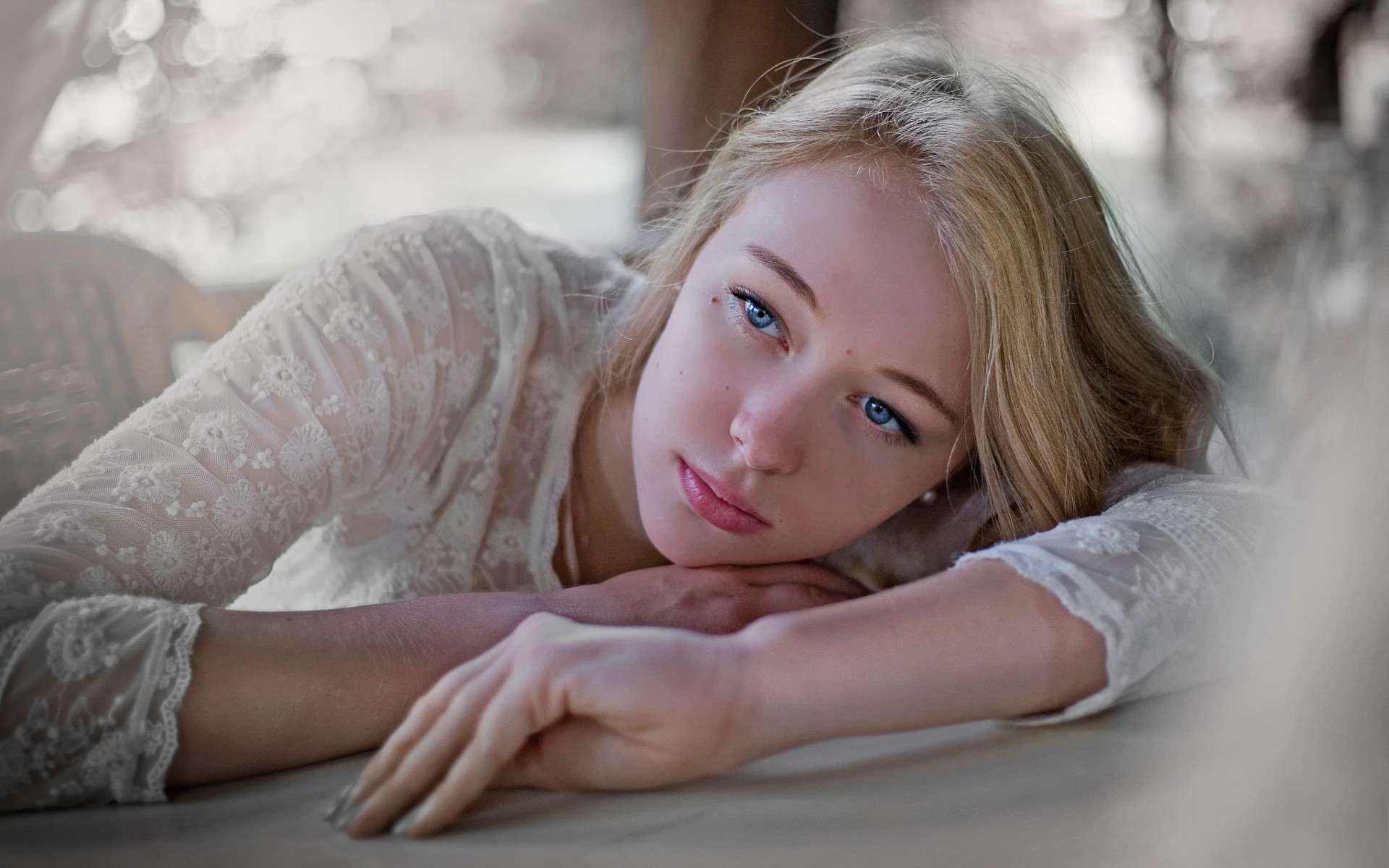 Description: A woman laying on a table with her hand on her chin and looking at the camera with a serious look on her face.