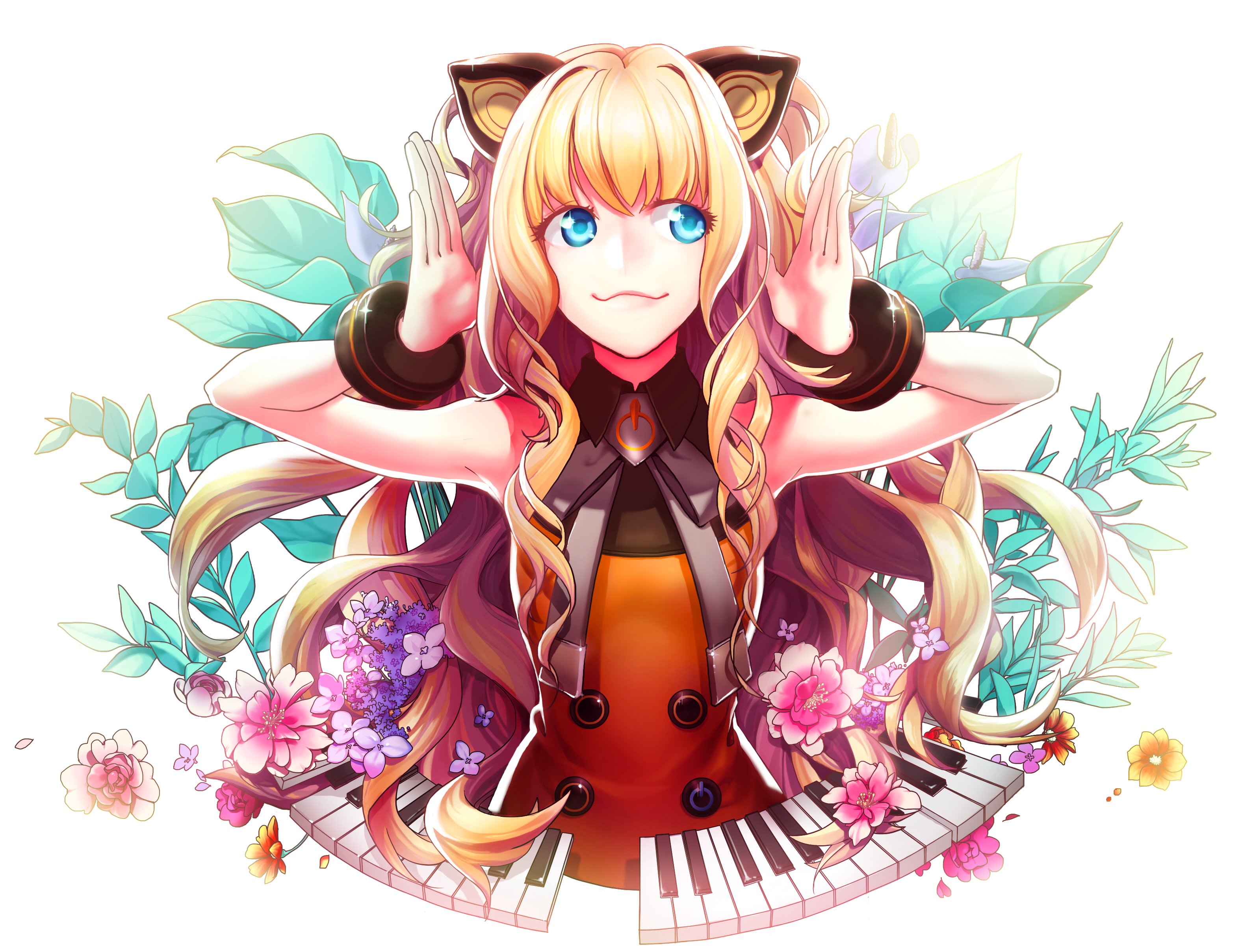 Description: A woman with long blonde hair and a cat ears on her head is standing in front of a piano.