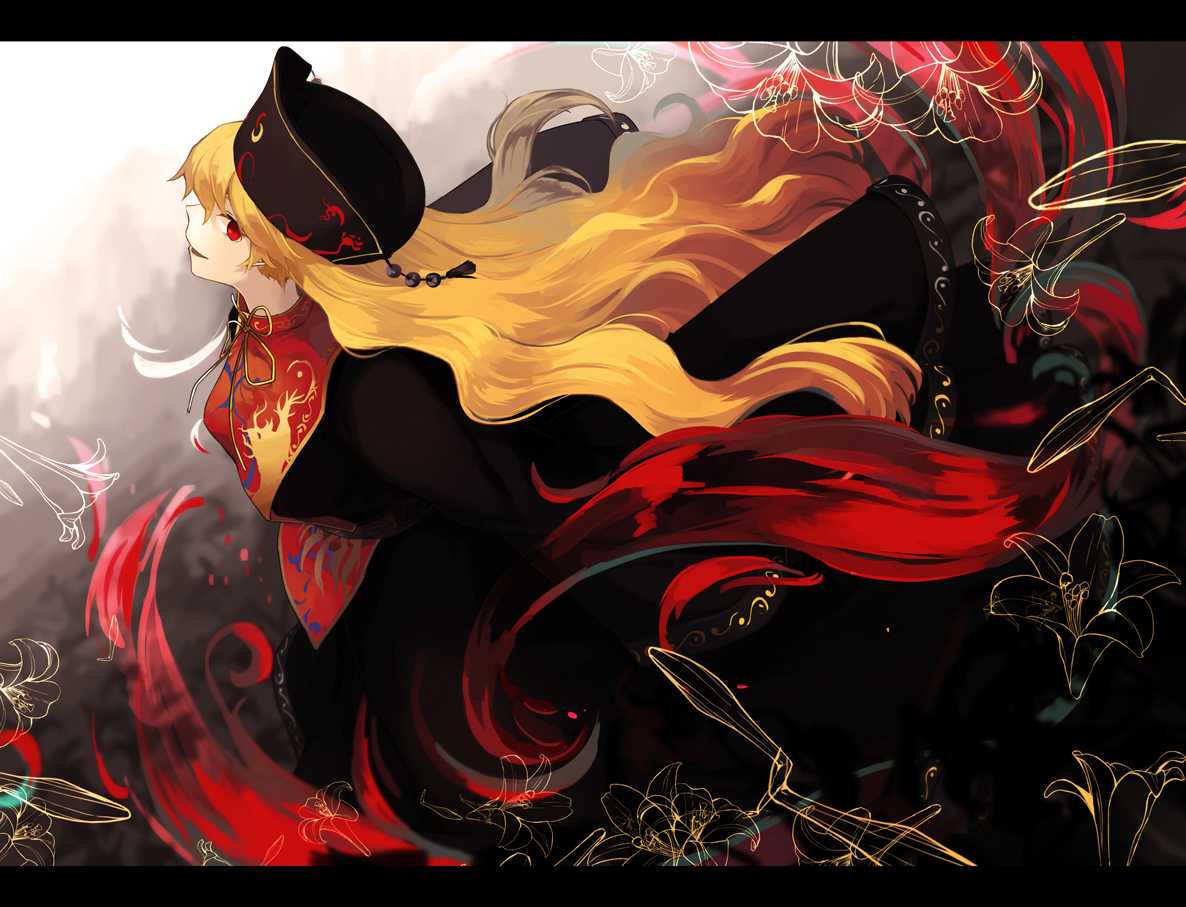 Description: A woman with long blonde hair and a hat on her head is surrounded by flowers and butterflies in a graphic style.