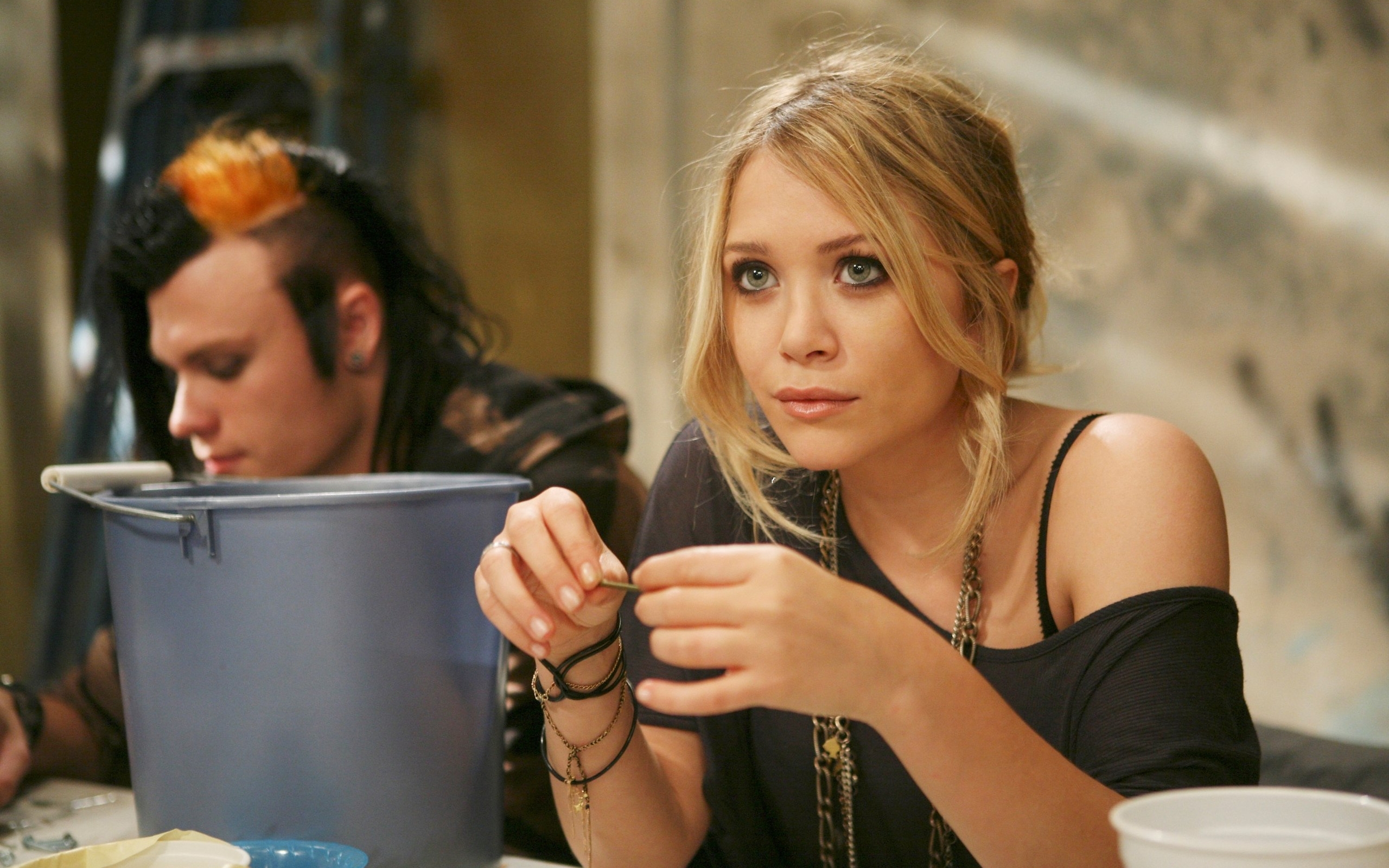 Description: A woman sitting at a table with a bucket of food in front of her and a man behind her.