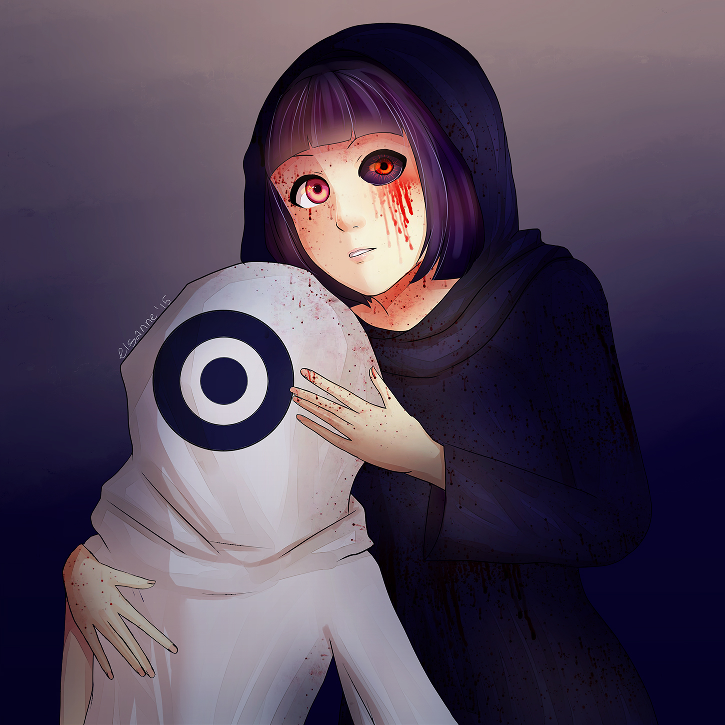 Description: A woman with blood on her face and a hoodie on her head hugging a man with blood on his face.