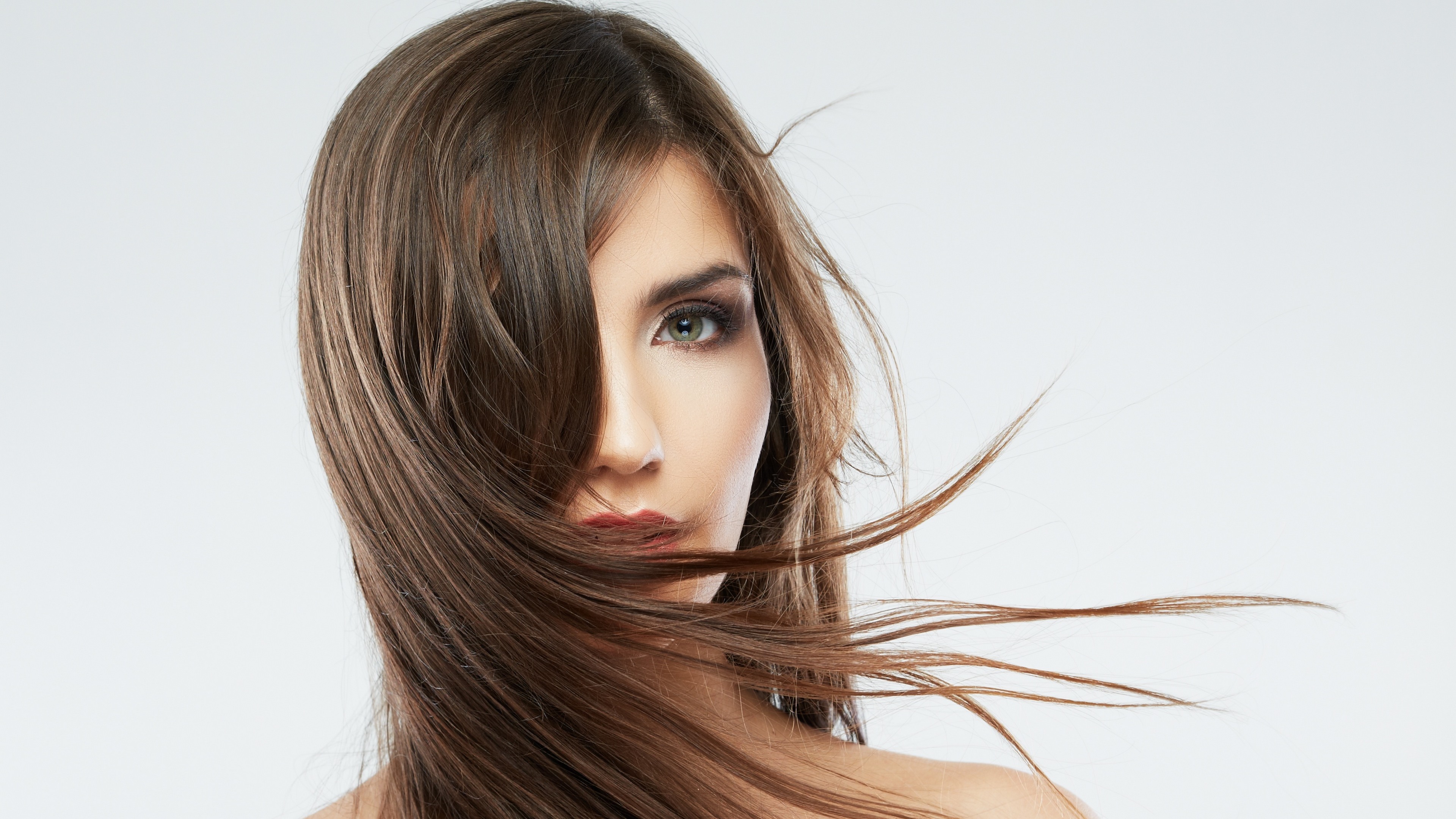 Description: A woman with long hair blowing in the wind with her eyes closed and her hair flying in the wind.