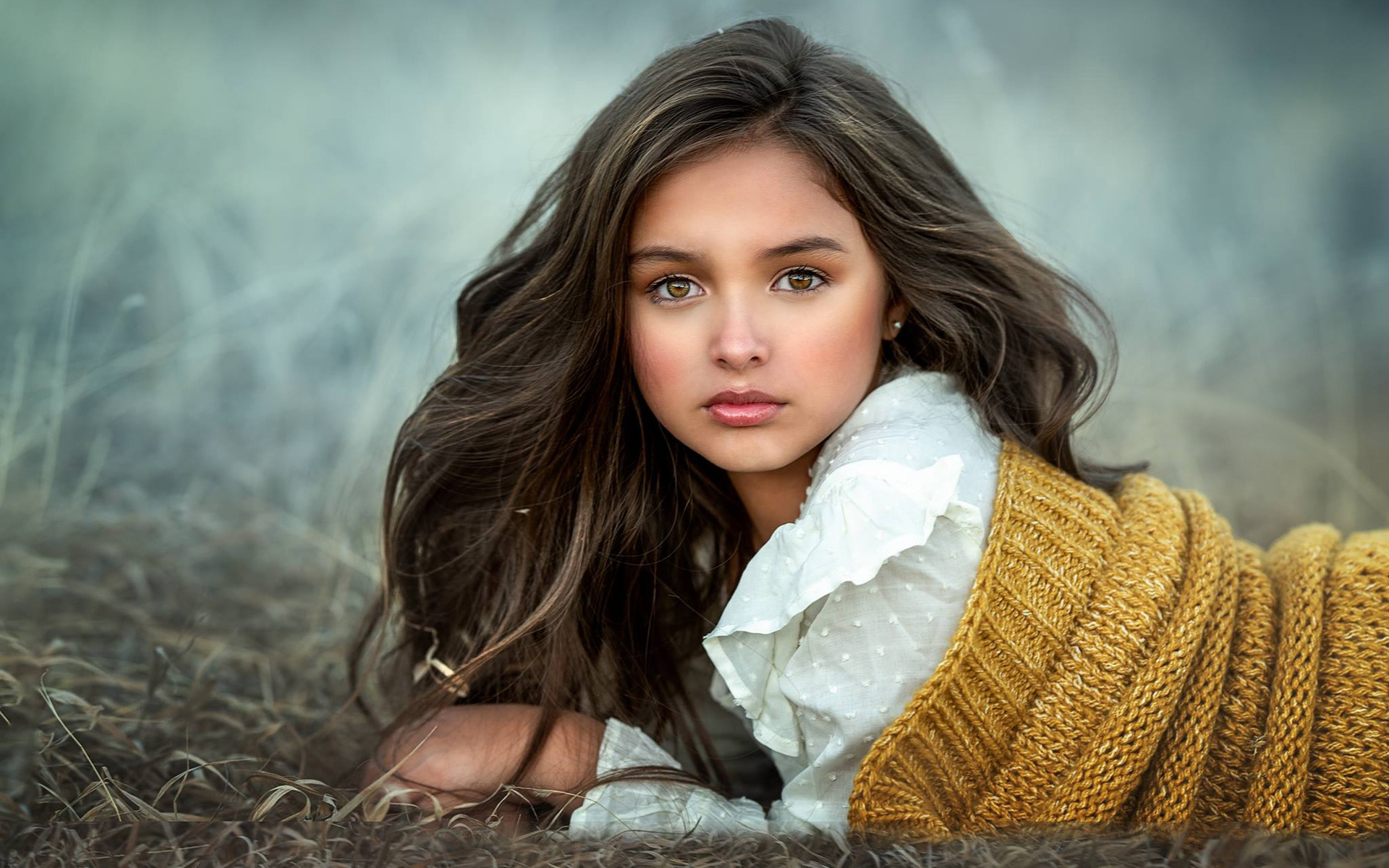 Description: A woman laying on the ground with her hair blowing in the wind and wearing a sweater and a scarf.