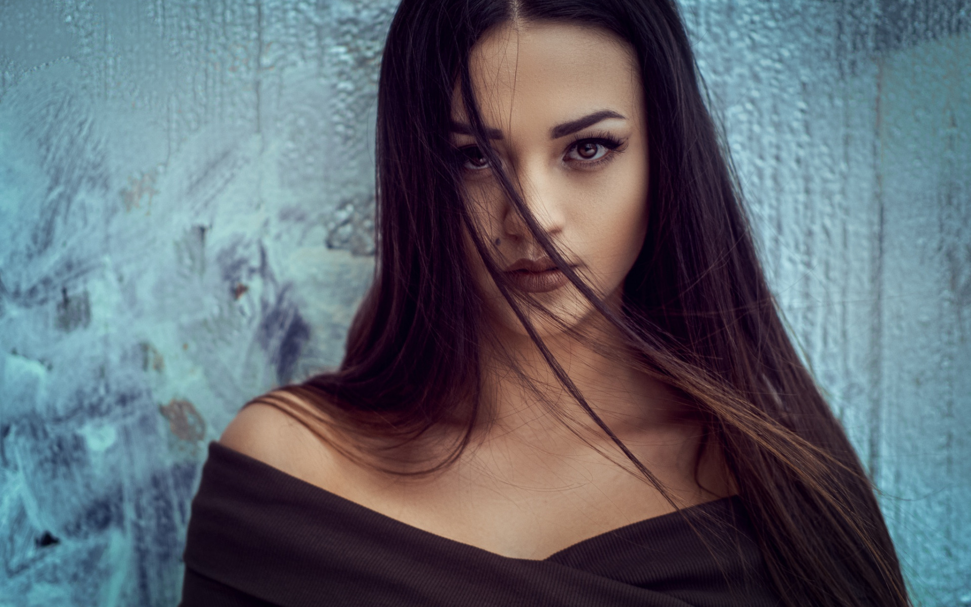 Description: A woman with long hair standing in front of a wall with a blue background and a blue background behind her.