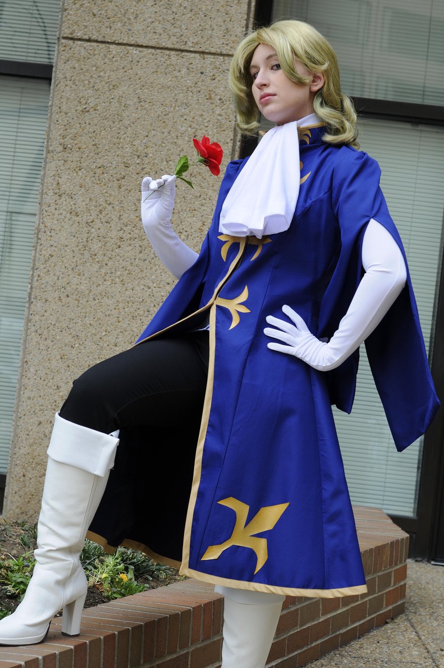 Description: A woman dressed in a blue costume and white boots is sitting on a step and holding a flower in her hand.