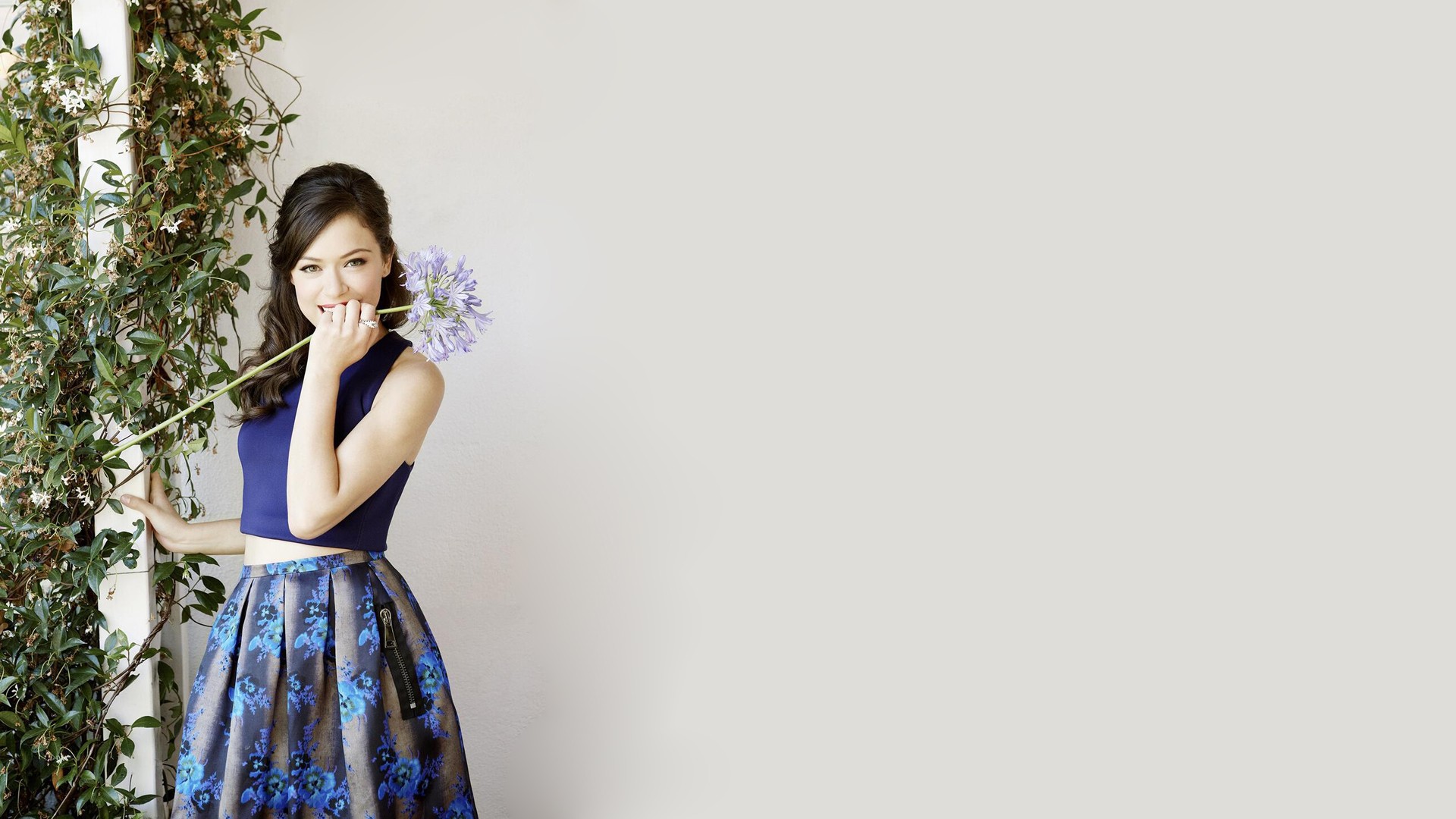 Description: A woman in a blue dress holding a flower in her hand and posing for a picture with a white wall behind her.