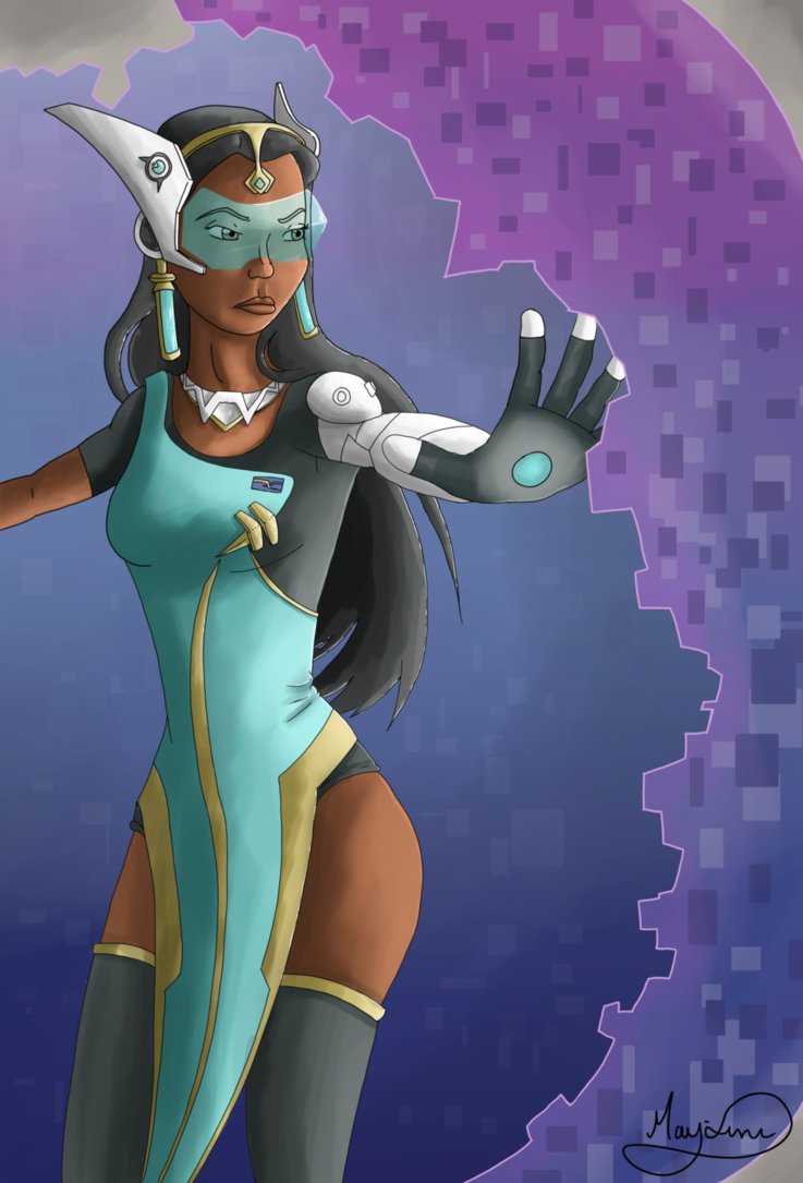 Description: A woman in a blue dress holding a knife and a ball in her hand with a purple background and a blue and yellow design.
