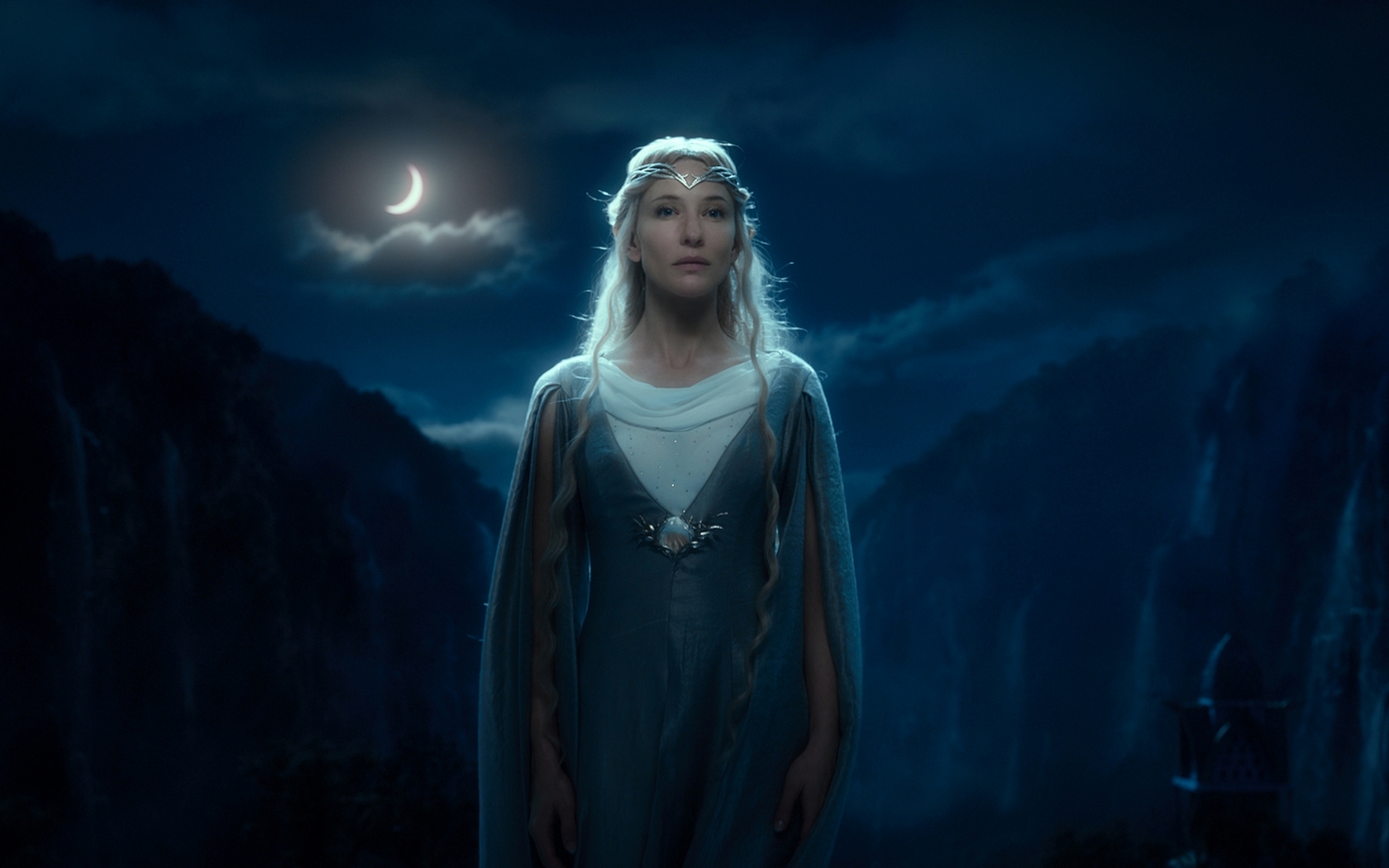 Description: A woman in a blue dress standing in front of a mountain at night with a crescent moon in the sky.