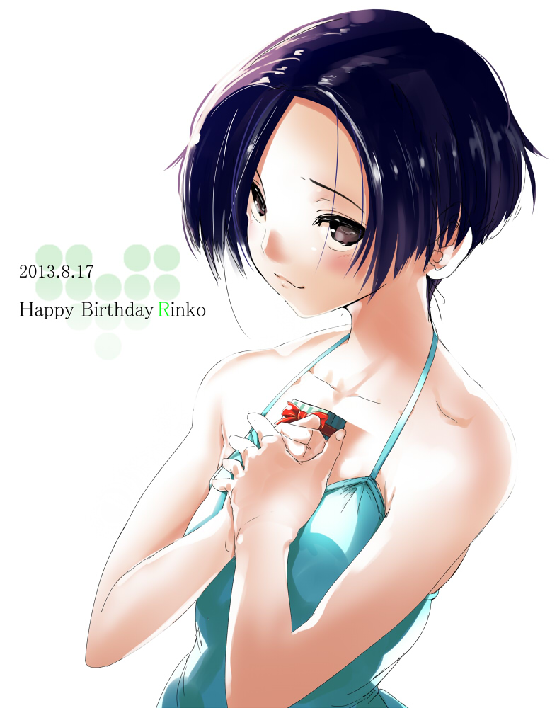 Description: A woman in a blue dress holding a red object in her hand and a happy birthday card in the other hand.