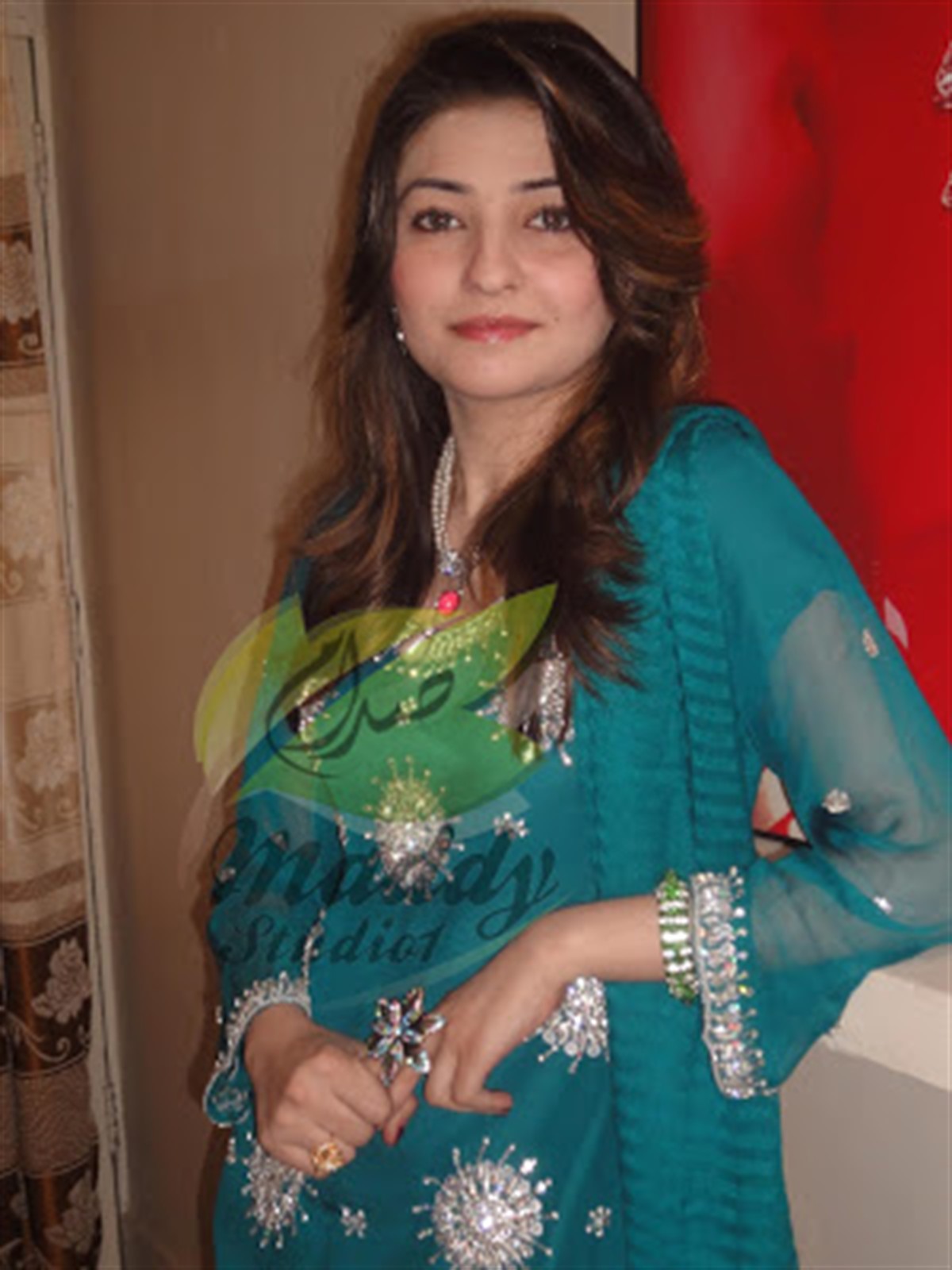 Description: A woman in a blue dress standing in front of a red wall with a green and white design on it.