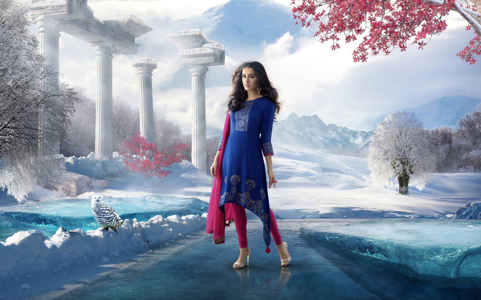 Description: A woman in a blue dress standing in a snowy landscape with columns and a tree in the background.