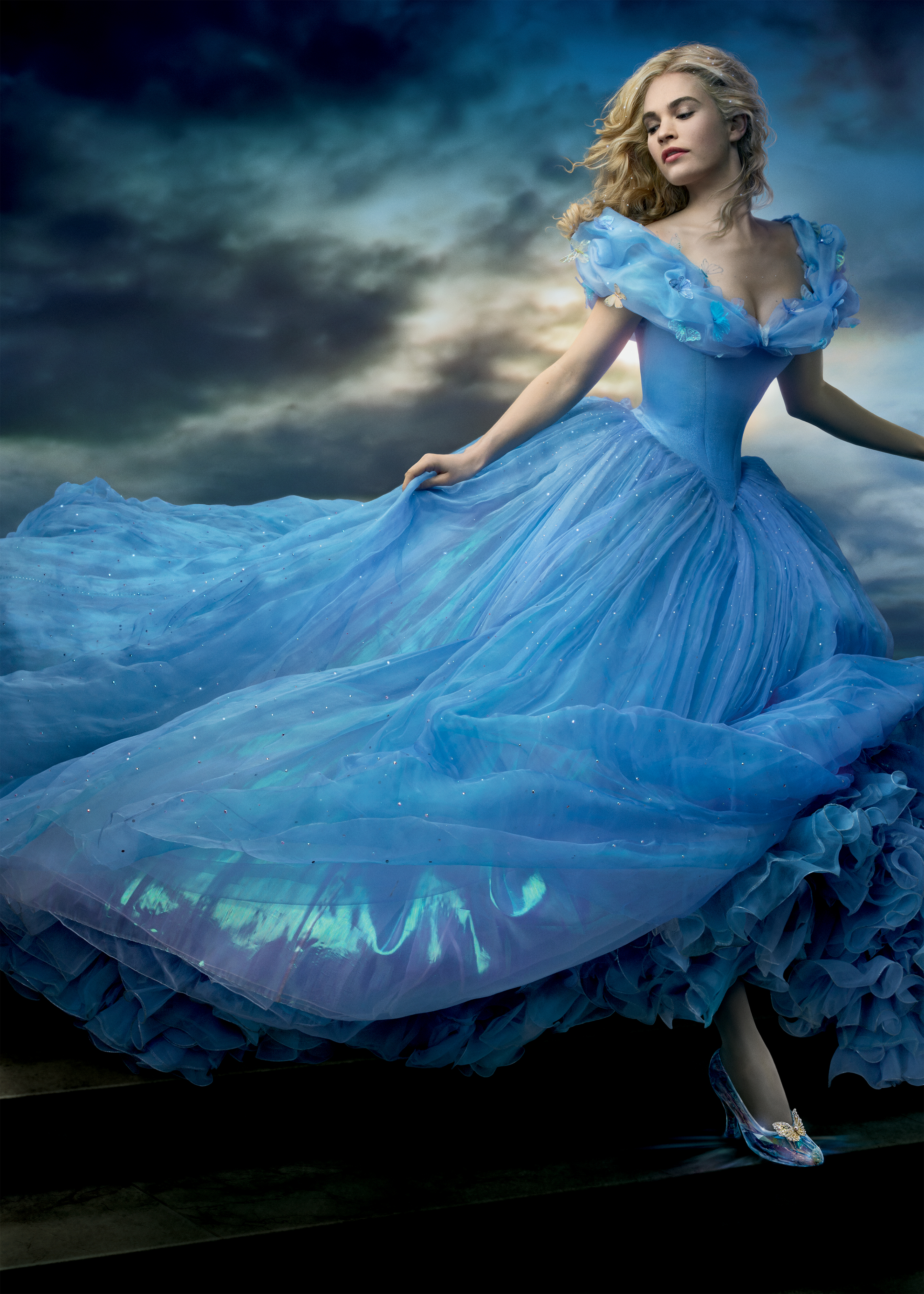 Description: A woman in a blue dress is standing on a stair case with a cloudy sky behind her and a dark background.