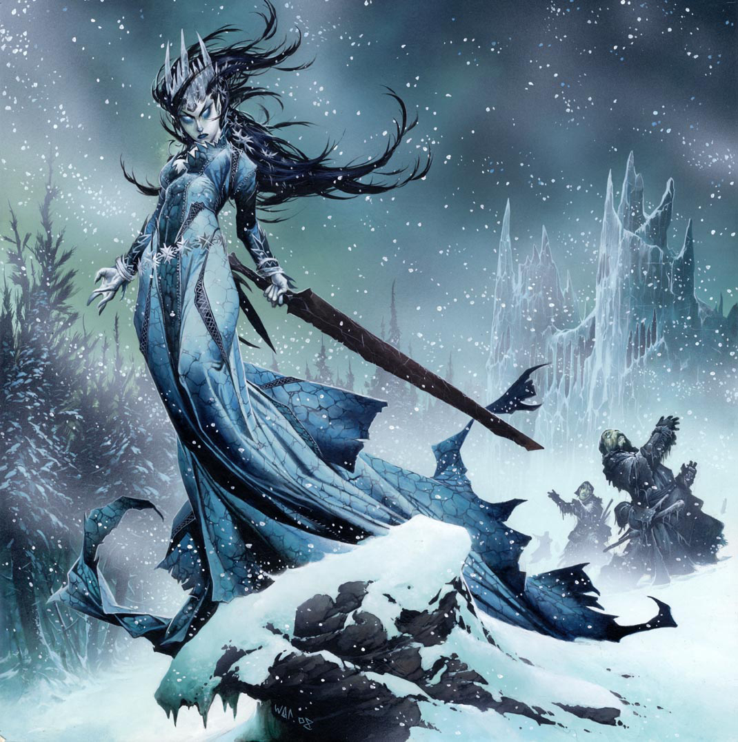 Description: A woman in a blue dress holding a sword in a snowy forest with sharks around her and a castle in the background.