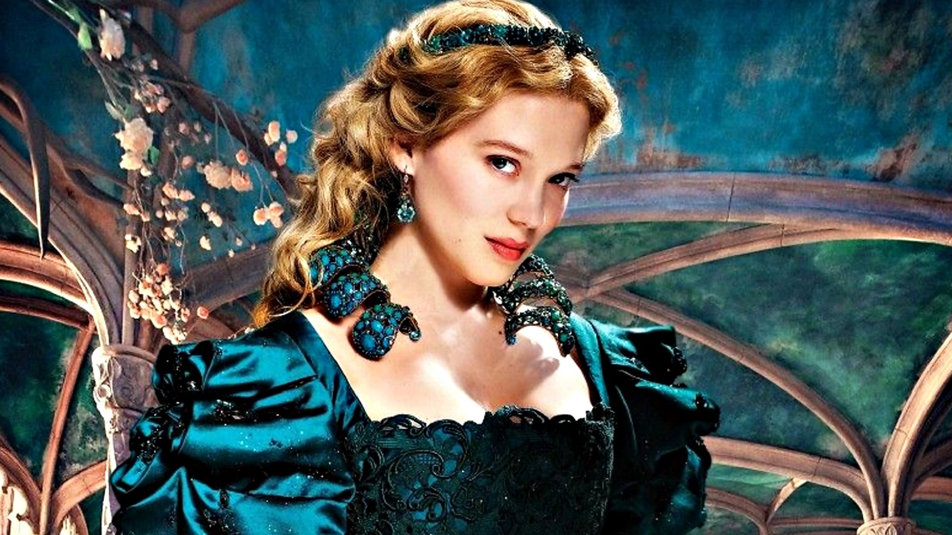 Description: A woman in a blue dress with a tiara on her head and a green dress with a flowered design on it.