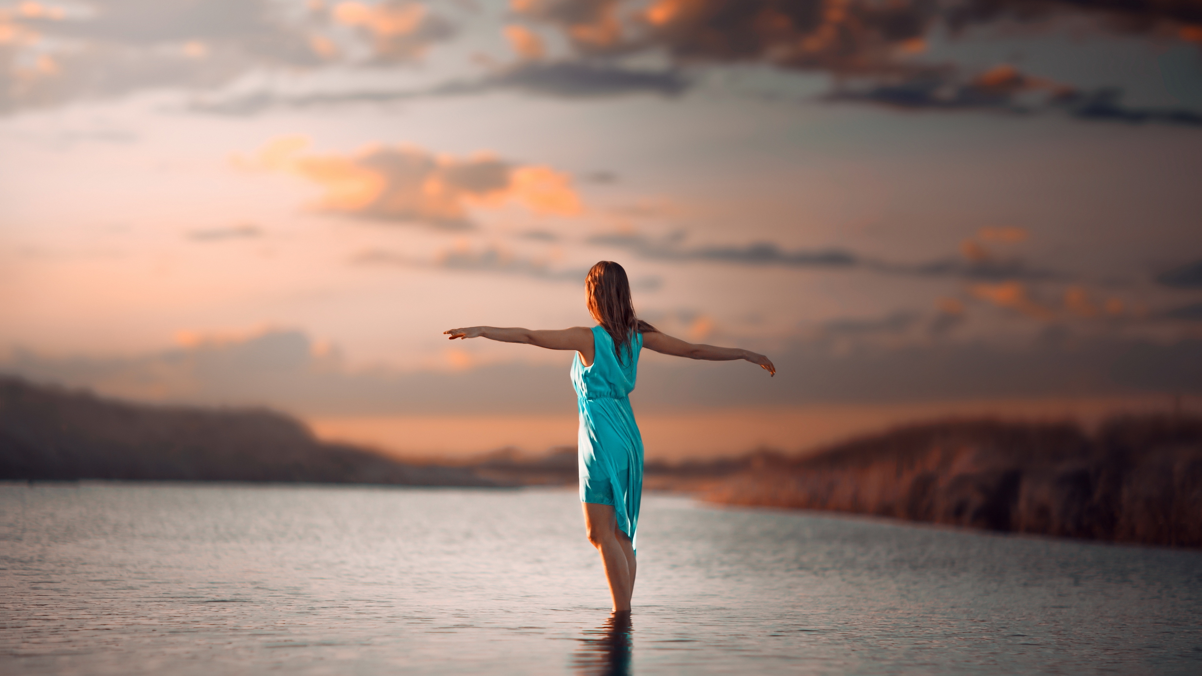 Description: A woman in a blue dress standing in the water with her arms outstretched in the air and her arms outstretched.