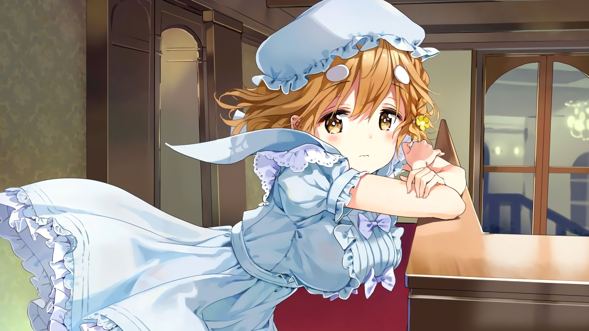 Description: A woman dressed in a blue dress and hat with a white dress on her head and a white dress on her body.