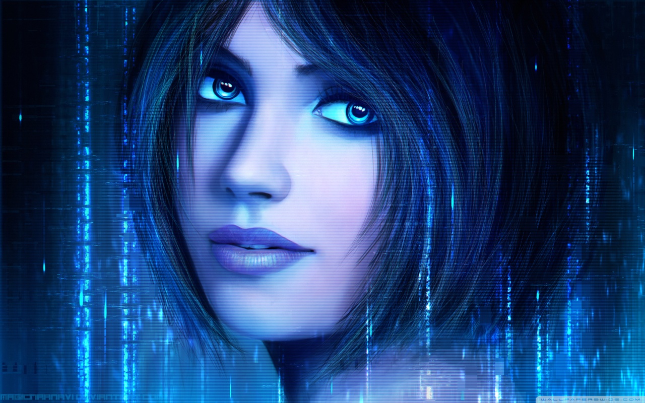 Description: A woman with blue eyes and a futuristic background with lines of blue and white dots and lines of blue and white dots.