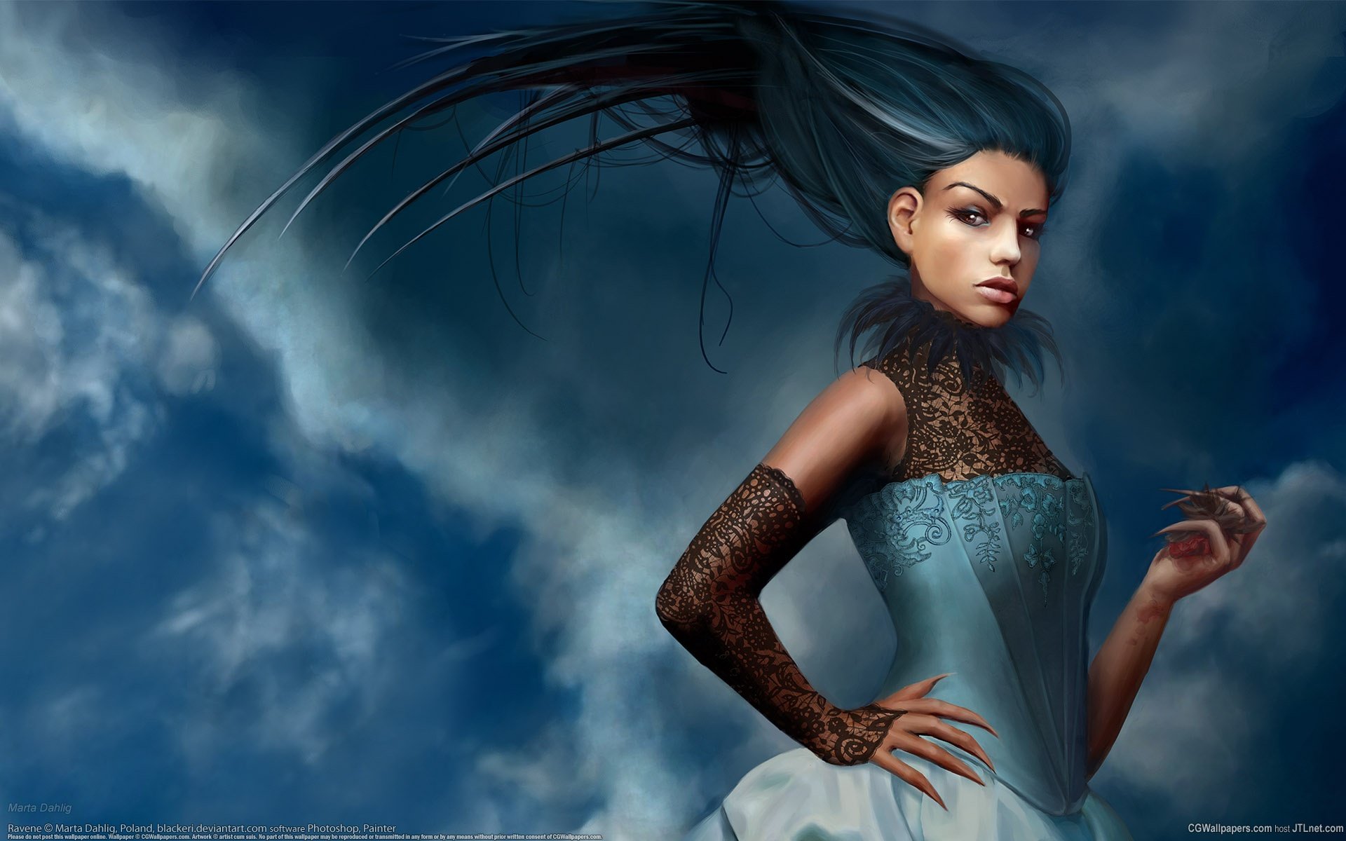 Description: A woman with blue hair and a dress on a cloudy day with a bird flying overhead in the sky.