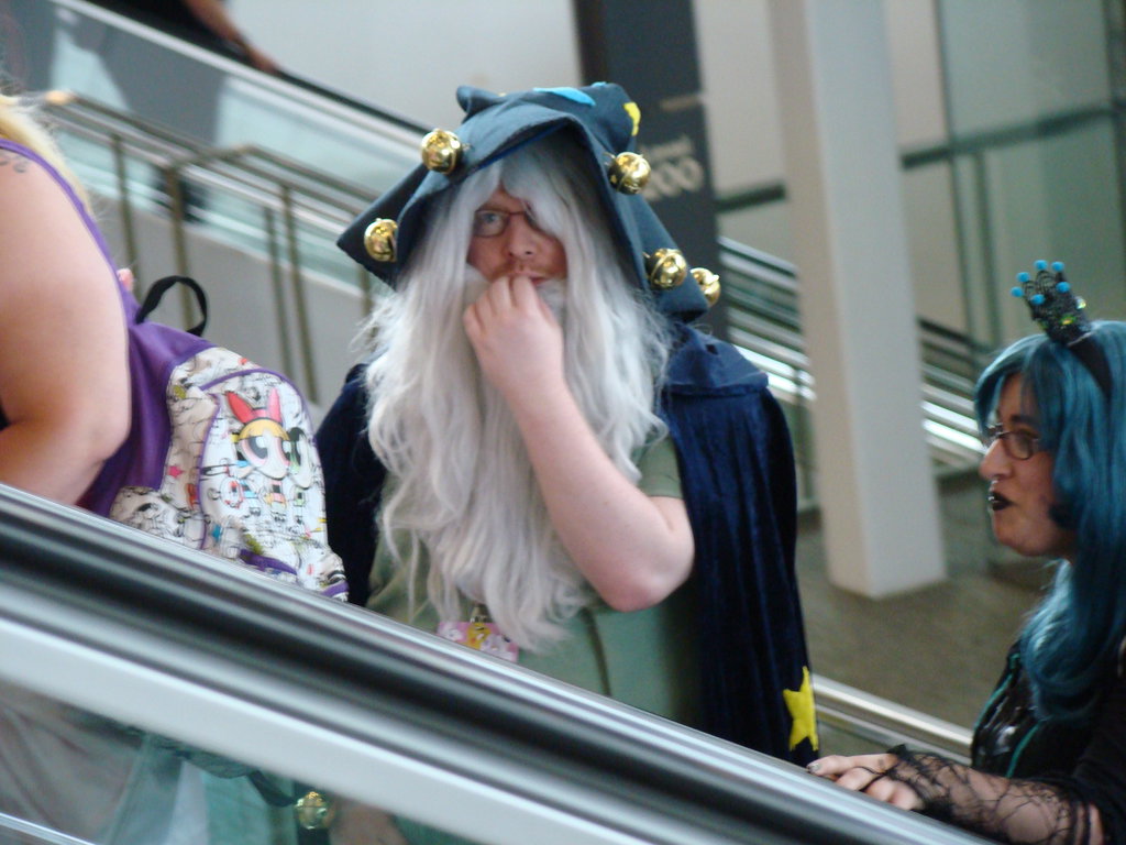 Description: A woman with blue hair and a white beard wearing a wizard costume and a blue wig and a white wig.